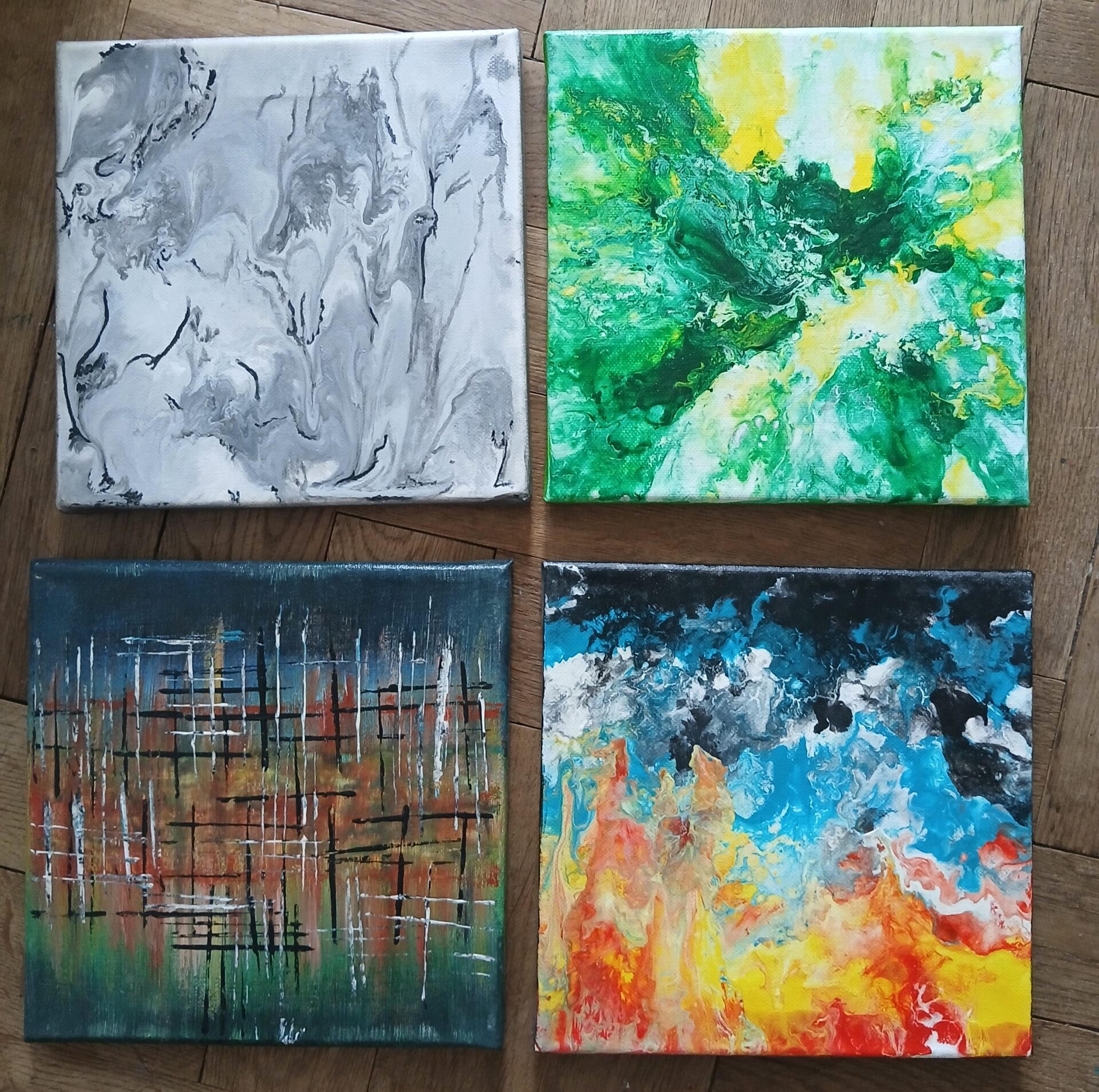 Zestaw 4 obrazów malowanych akrylem na płótnie. Boki są zamalowane, więc nie jest potrzebna rama, obraz gotowy do zawieszenia.