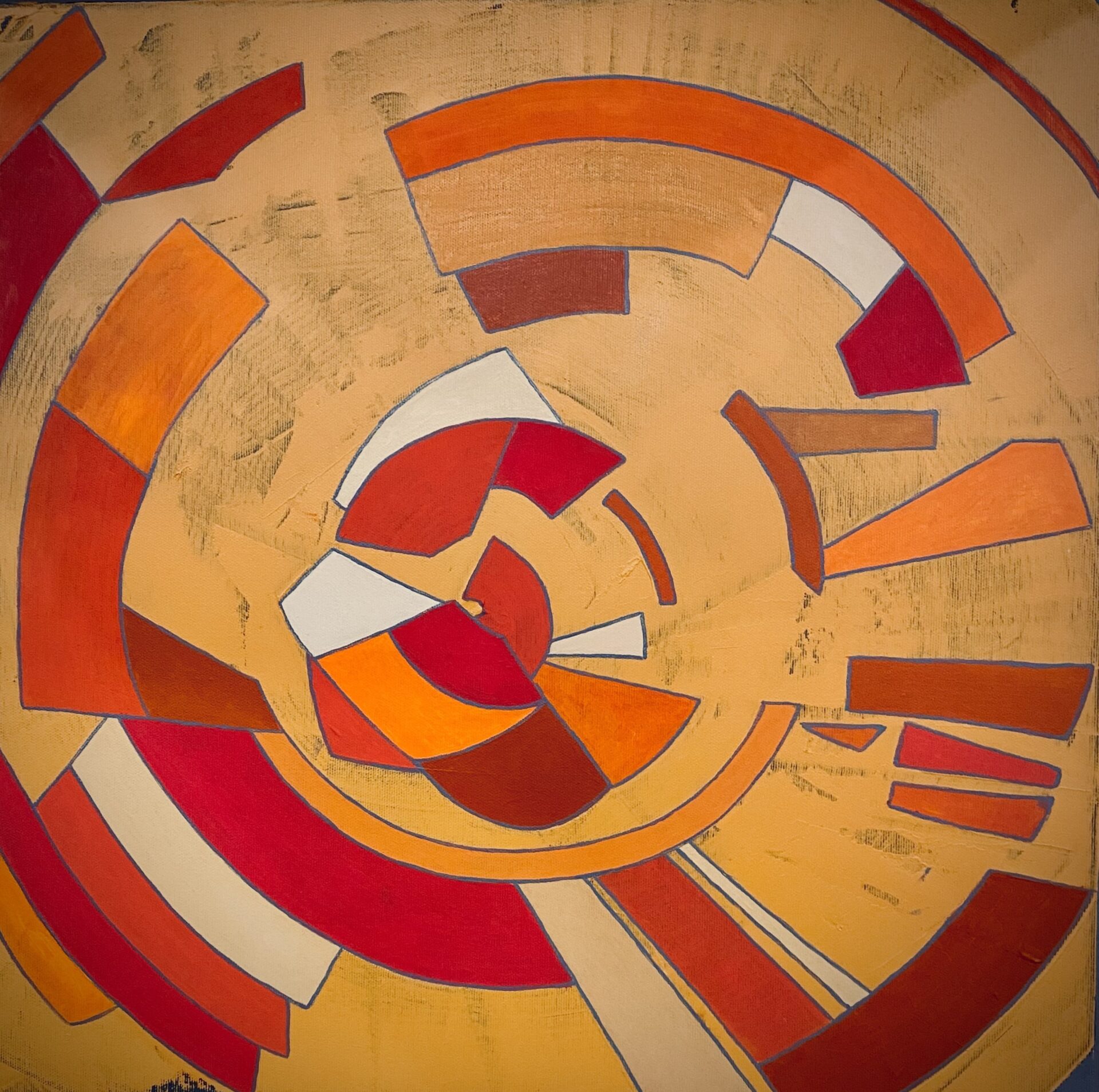 Abstrakcyjny, dynamiczny obraz w ciepłych barwach. Boki płótna zamalowane, gotowy do powieszenia.