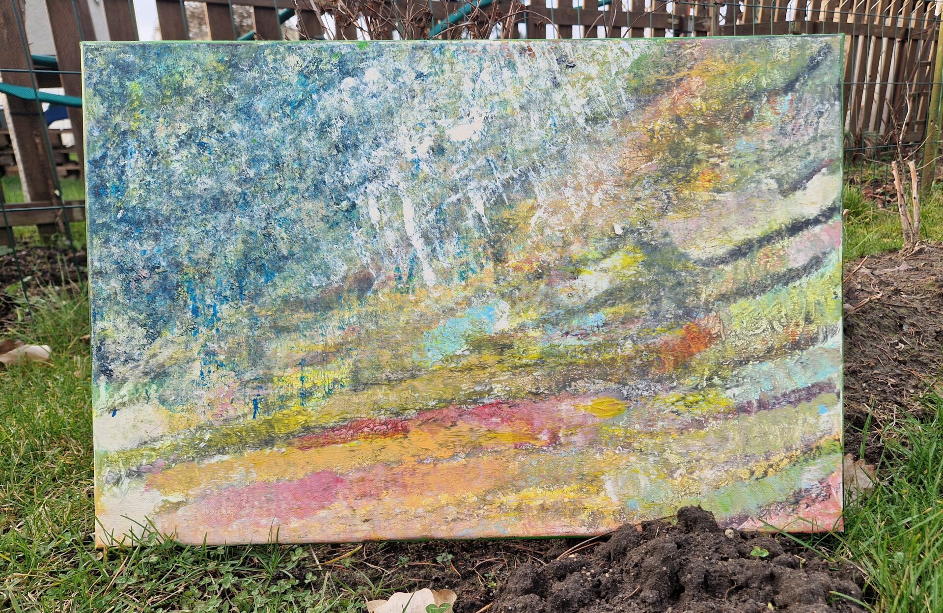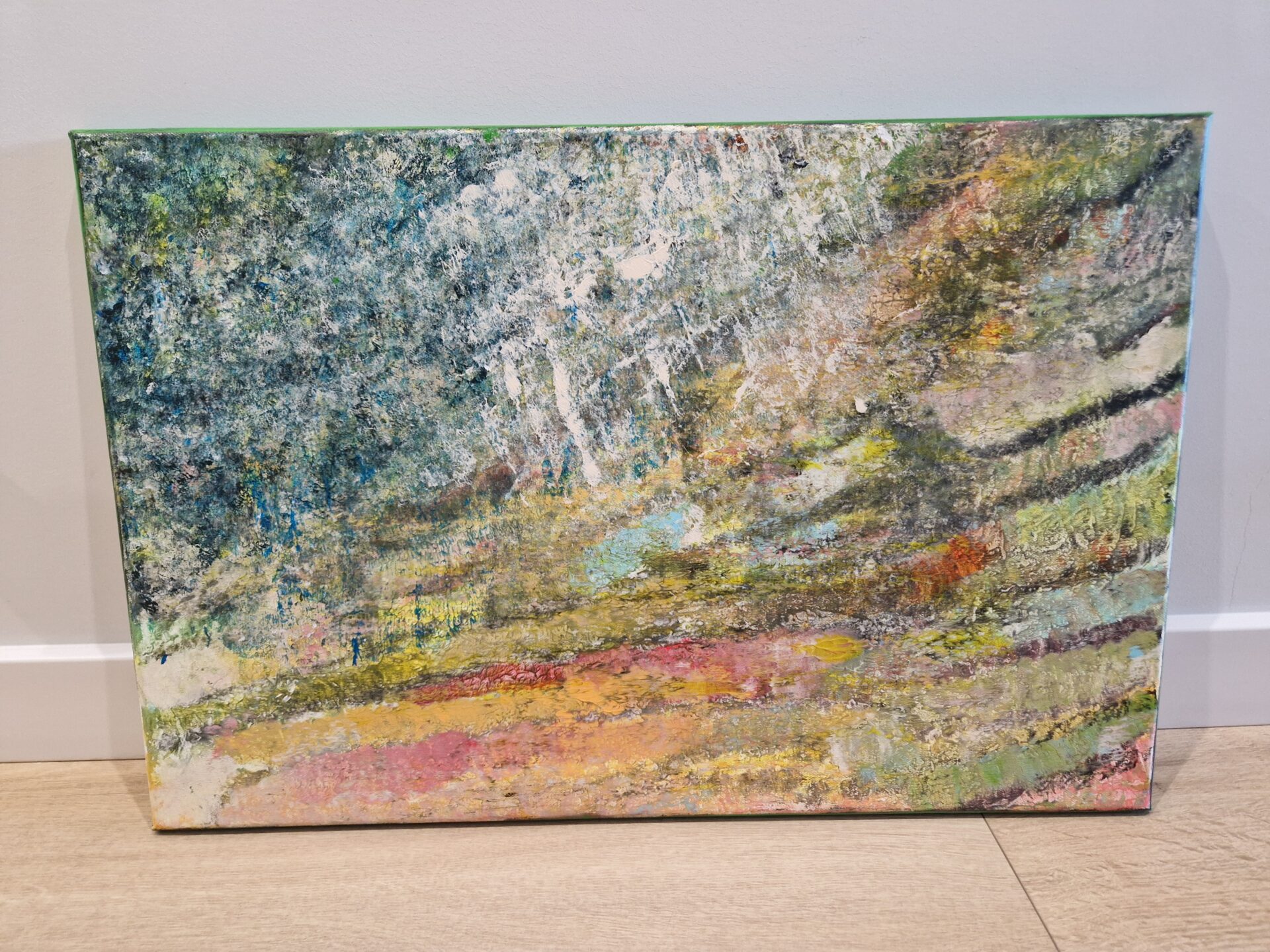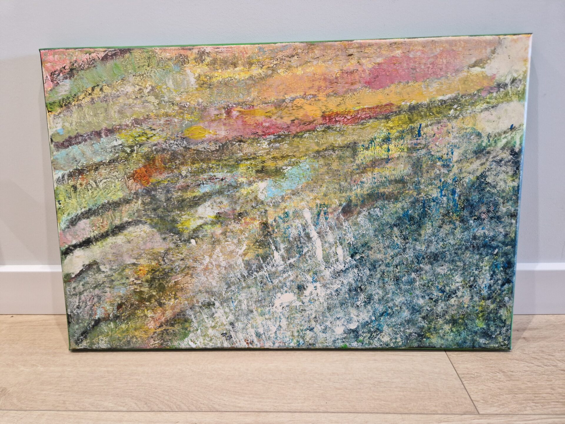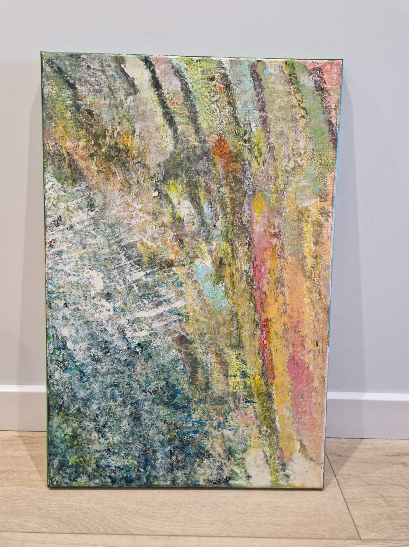 Obraz malowany na płótnie, akrylem, pokryty werniksem. Wymiary 60/40. Bez nazwy (1) stan umysłu. Praca jest jedyną formą jaka powstała – unikat.