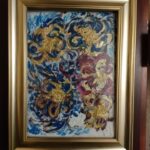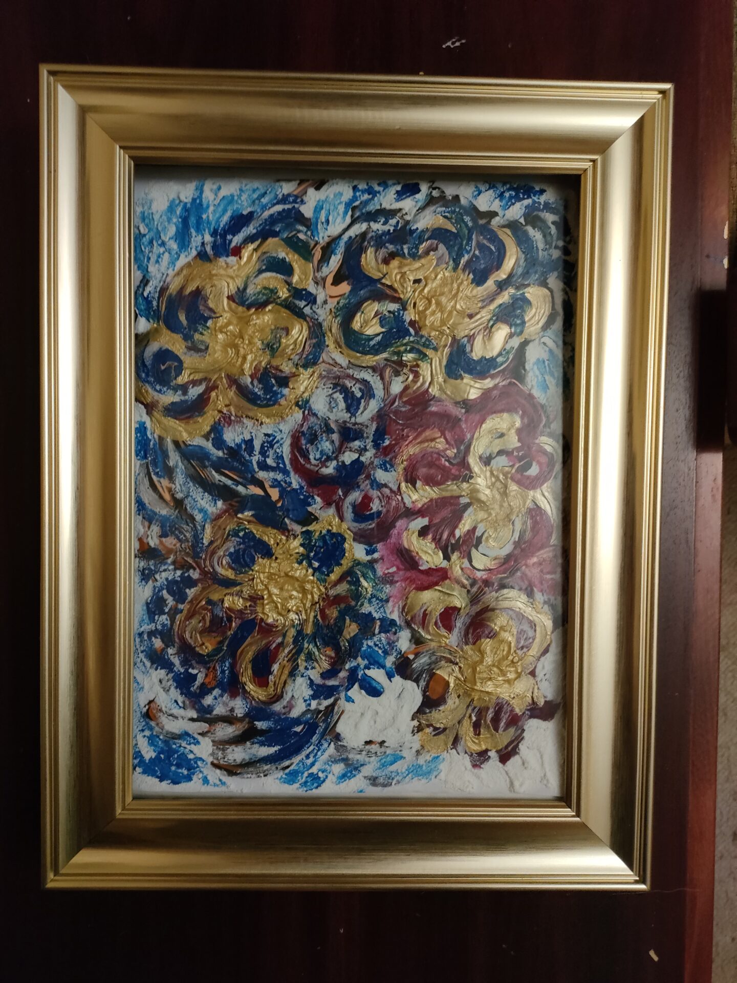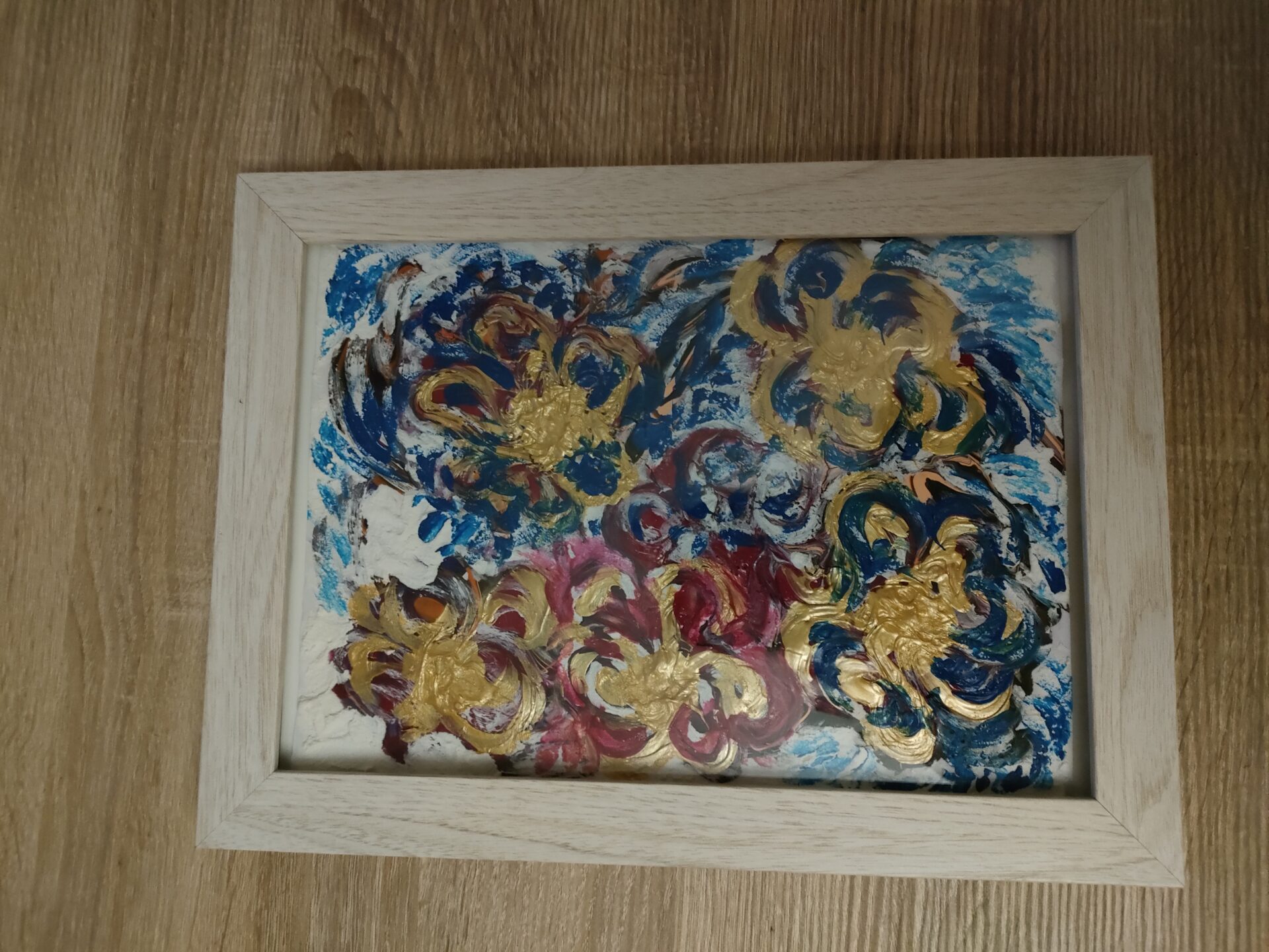 Kolorowe kwiaty błyszczą na tle gwiaździstego nieba, krawędzie łączą się w jedną całość stykając się brzegami płatków i wtapiając się wzajemnie we środki ich własnych zalążków, połączone błyszczą wachlarzem barw i połyskującym zlotem