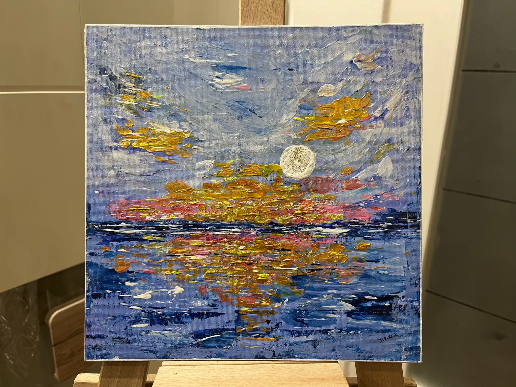 Abstrakcja na panelu 25×25 /obciągniętym płótnem/, farby akrylowe, brokat, zabezpieczony werniksem. Intensywniejsze barwy w rzeczywistości.