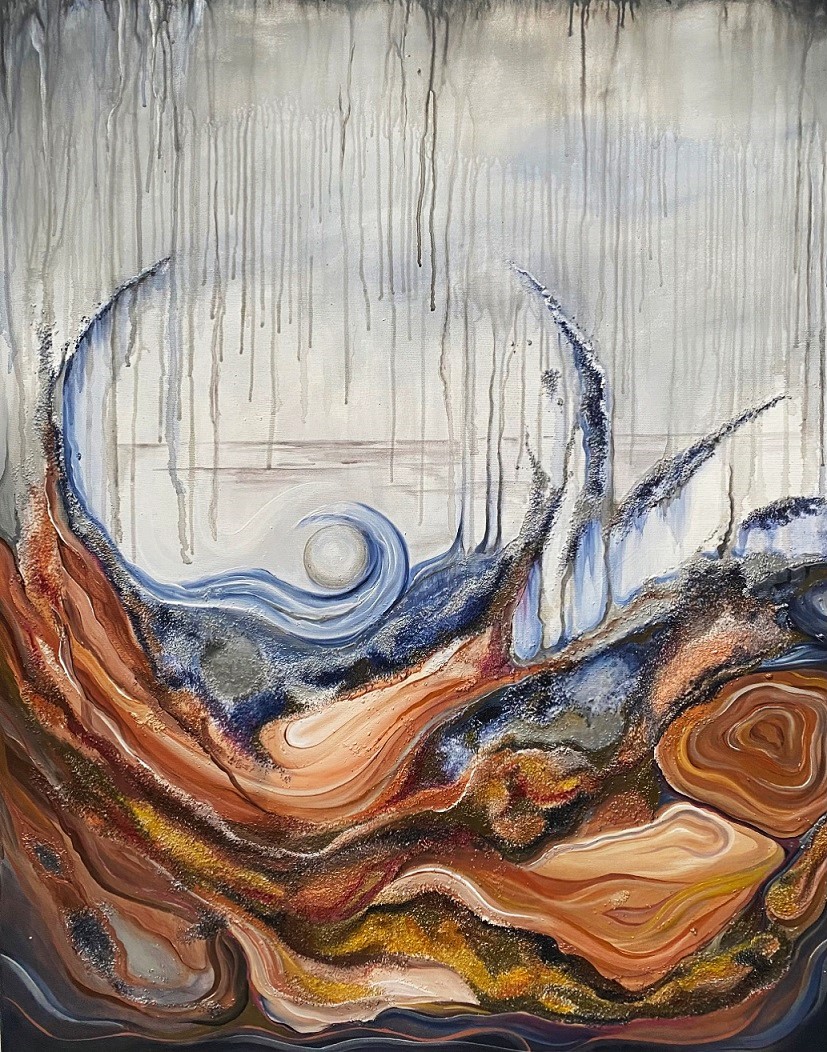 Obraz ręcznie malowany na płótnie, na grubym podobraziu 3D, boki szerokości 4 cm – zamalowane, nie wymaga dodatkowej oprawy, gotowy do zawieszenia. Wymiary 100×80 cm. Miejscami widoczna ziarnista faktura, nadająca obrazowi głębię. Całość pokryta zabezpieczającą warstwą werniksu.