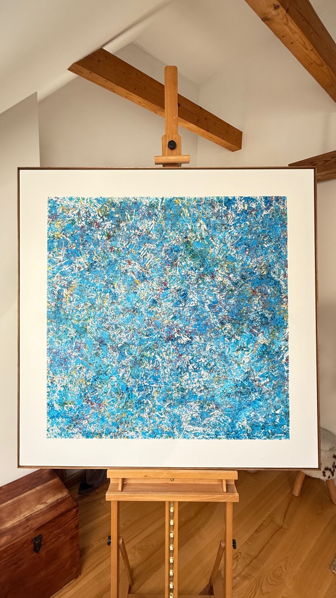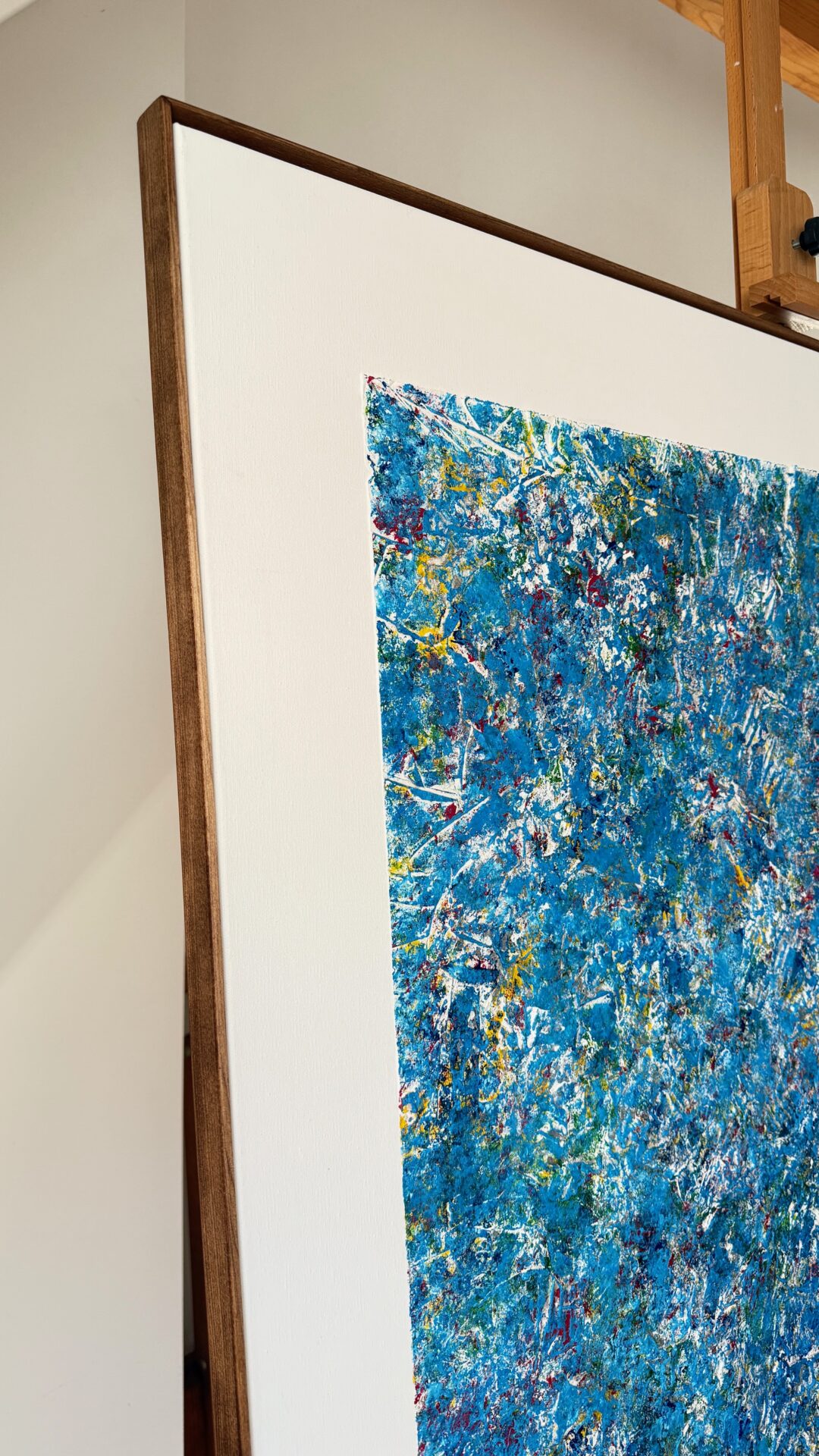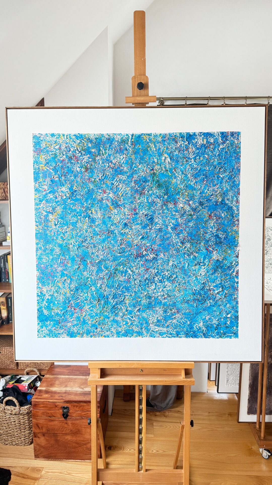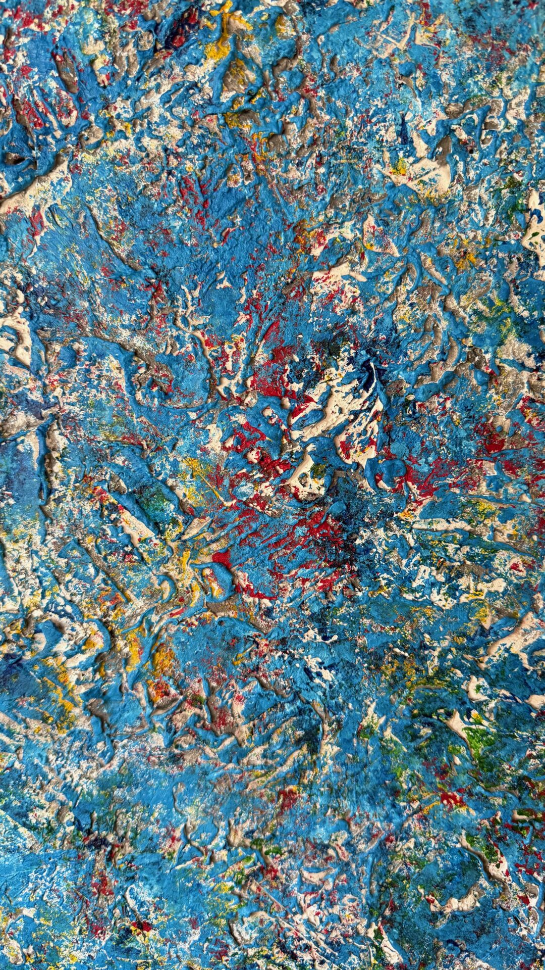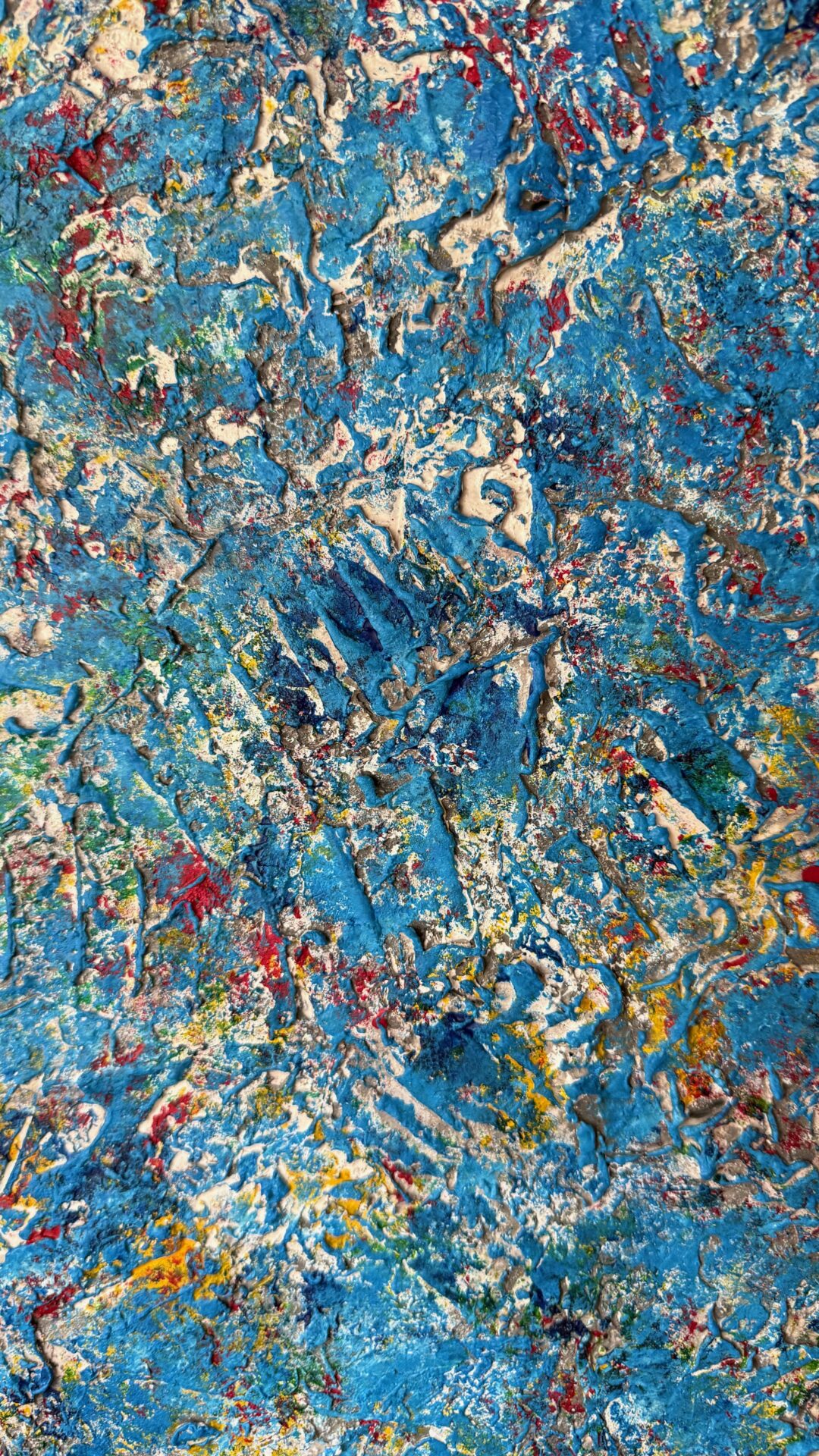 Obraz abstrakcyjny o strukturalnej formie 110×100. Akryl i struktura na płótnie , zabezpieczony werniksem, oprawiony w ramę . Niepowtarzalny, hipnotyzujący swą kolorystyką i strukturą.