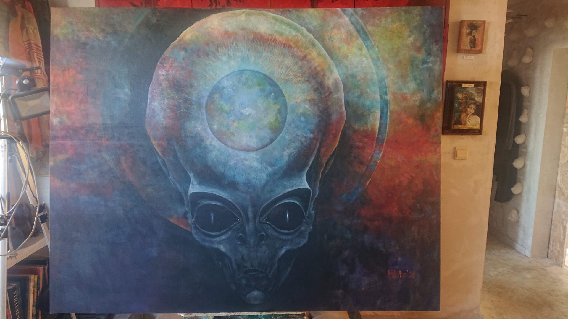 Acryl płótno, to wersja przedstawienia mitycznego bohatera, o nadprzyrodzonych mocach, postać wyłania sie subtelnie podczas przechodzenia wzdloz strony palego światła i zaskakuje możliwością bytu realnego, praca praca prezentuje się wszędzie bardo dobrze ale na dnie krateru wulkanu nie sprawdzalem