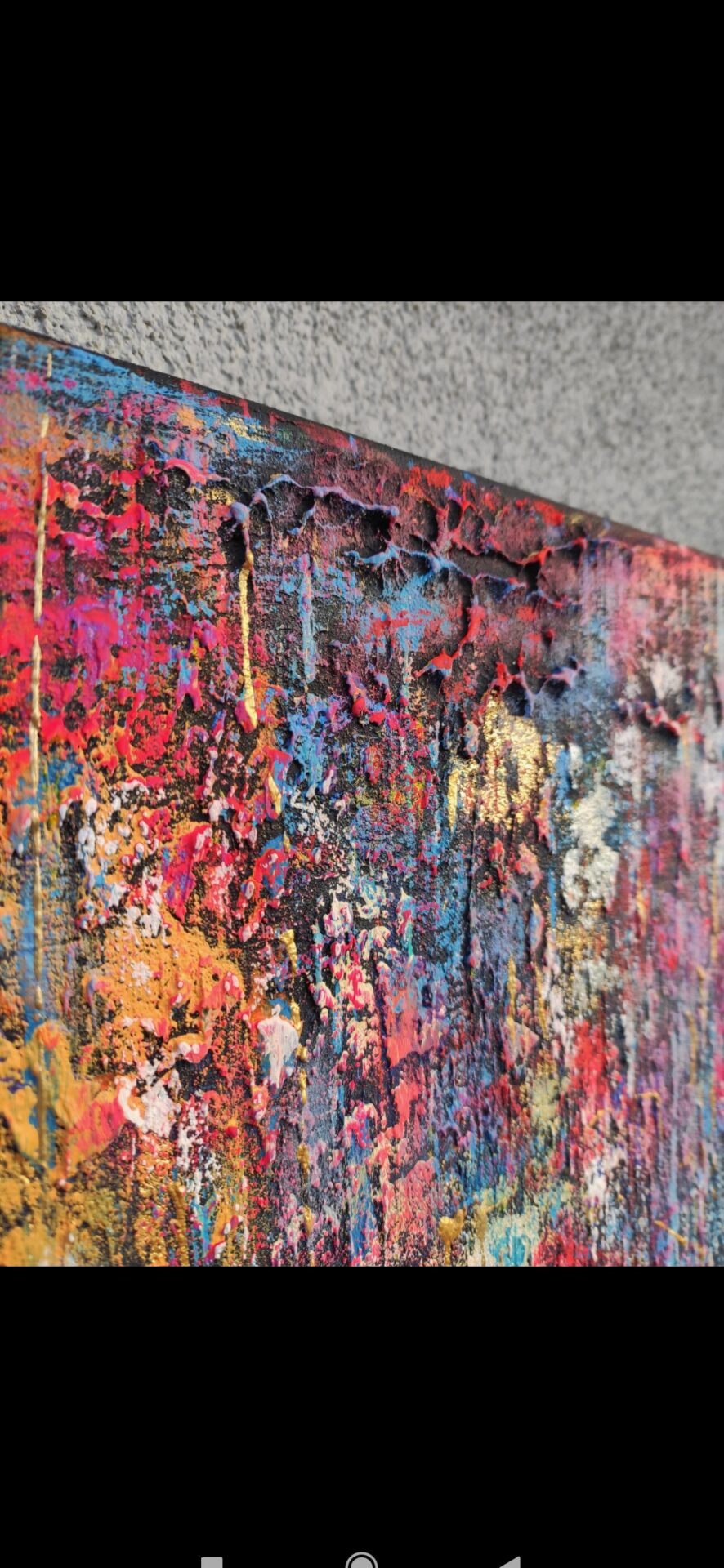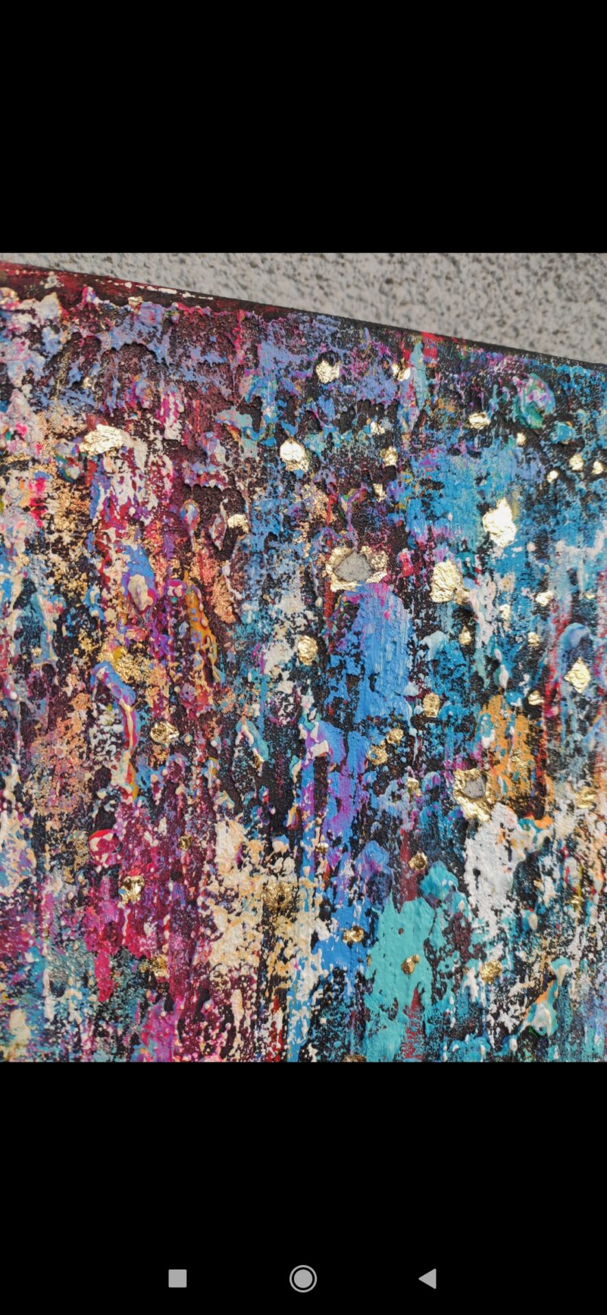 Na sprzedaż prezentuję obraz strukturalny wykonany przy użyciu farb akrylowych oraz mix media.Obraz niepowtarzalny z szeroką paletą barw podkreślonych złotymi akcentami.Praca została namalowana ręcznie na płóciennym podobraziu.Obraz jest gotowy do zawieszenia.Boki w kolorze czarnym.Obraz sygnowany i datowany.