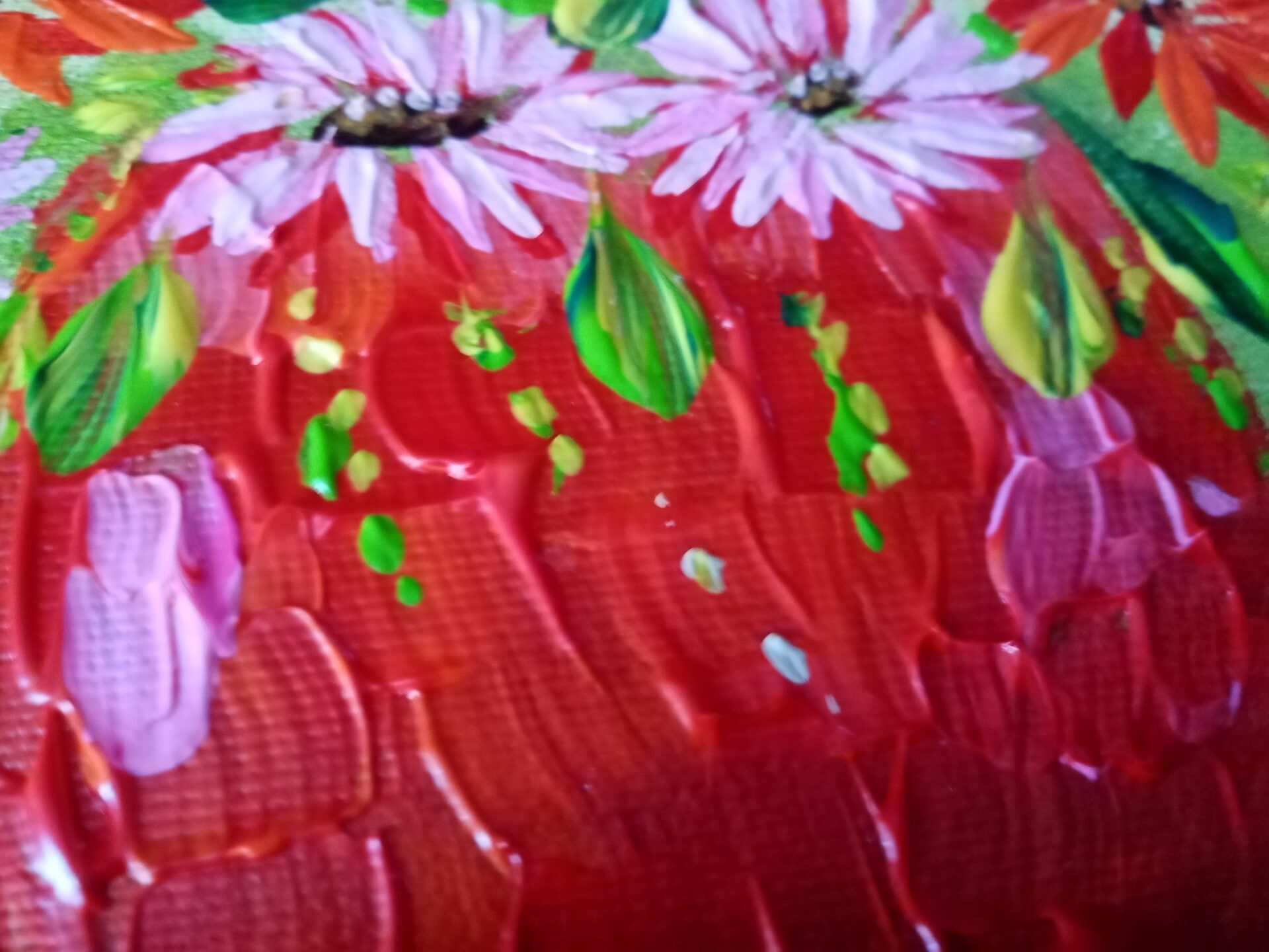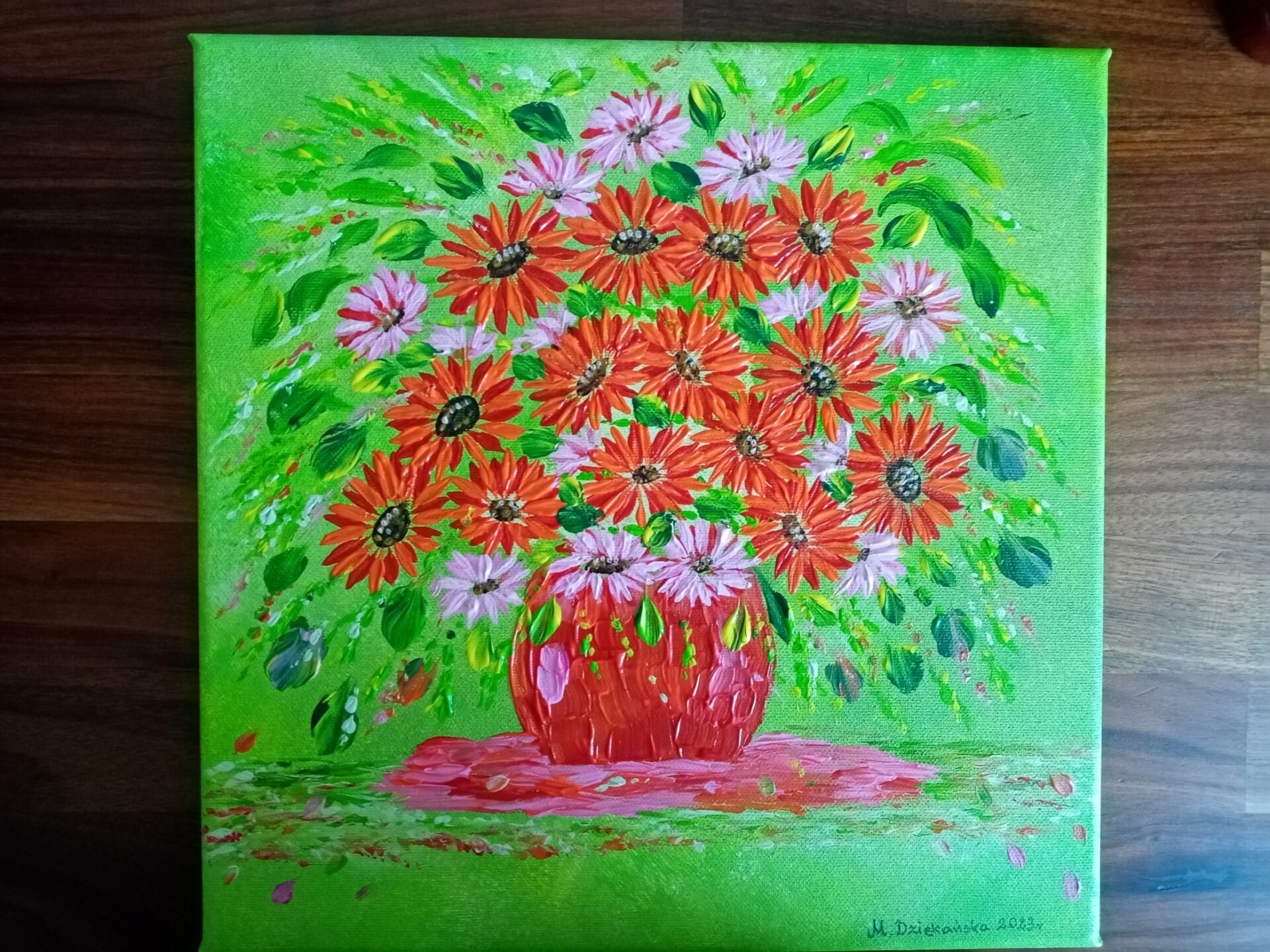 Obraz namalowany na profesjonalnym płótnie malarskim wysokiej jakości farbami akrylowymi.Wymiary 25 x 25. Gruba warstwa farby widoczna na zdjęciu.Praca jest sygnowana, zawerniksowana i dołączam do niej certyfikat certyfikat. Jest to moja praca