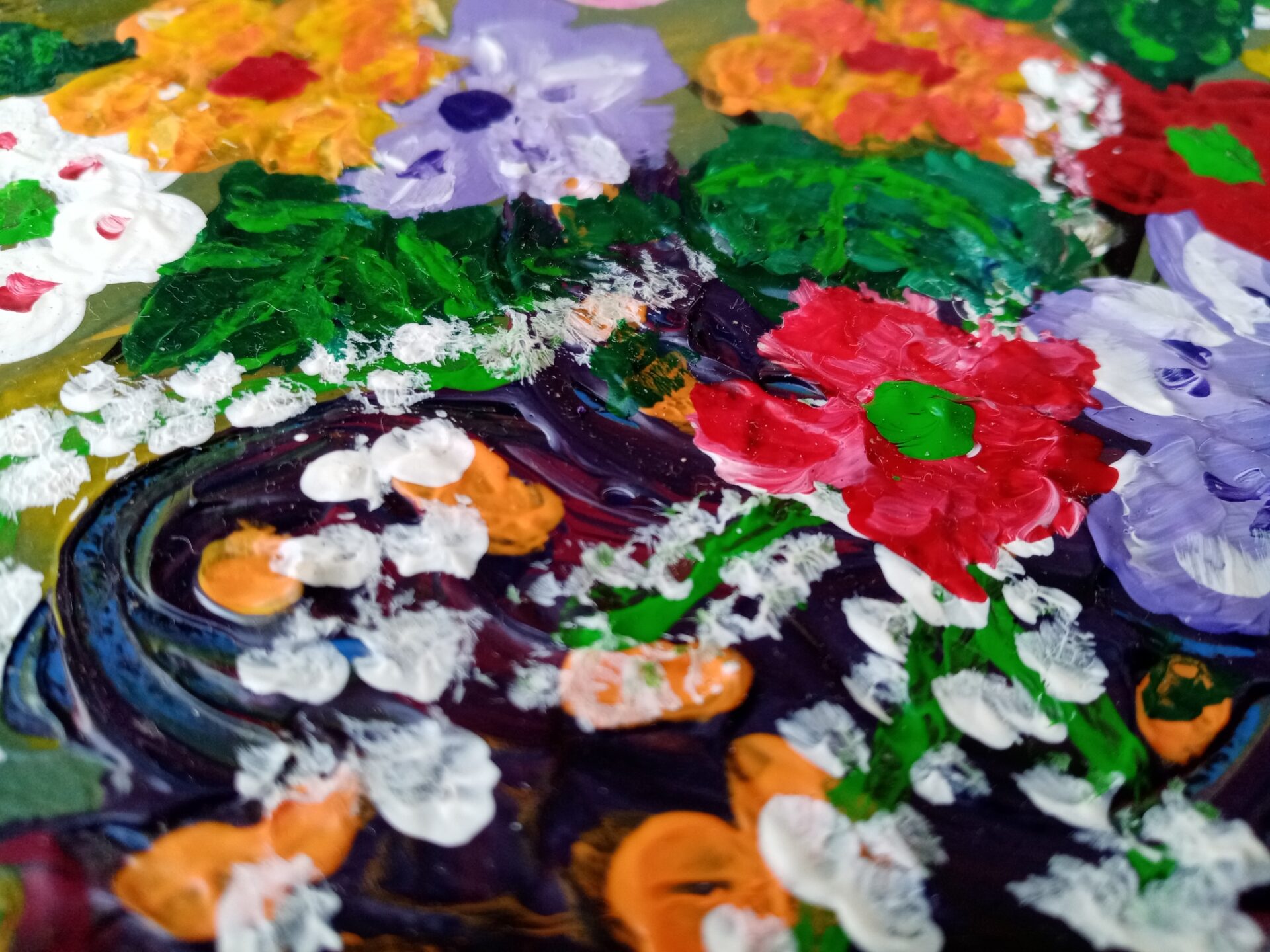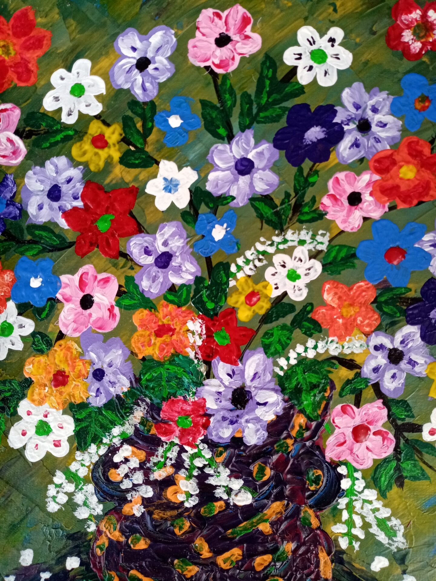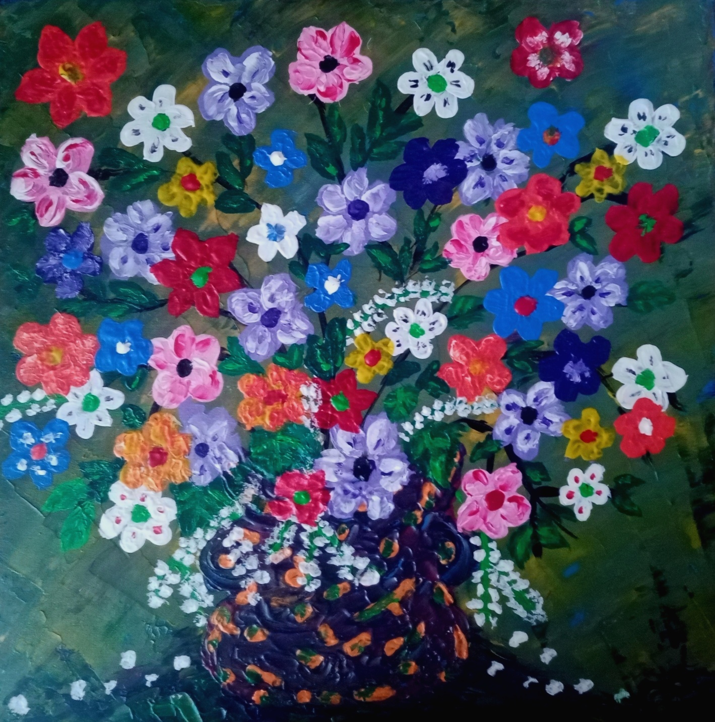 Zwykłe kwiaty , rozmiar 30 x 30, gruba warstwa farby widoczna na zdjęciach.