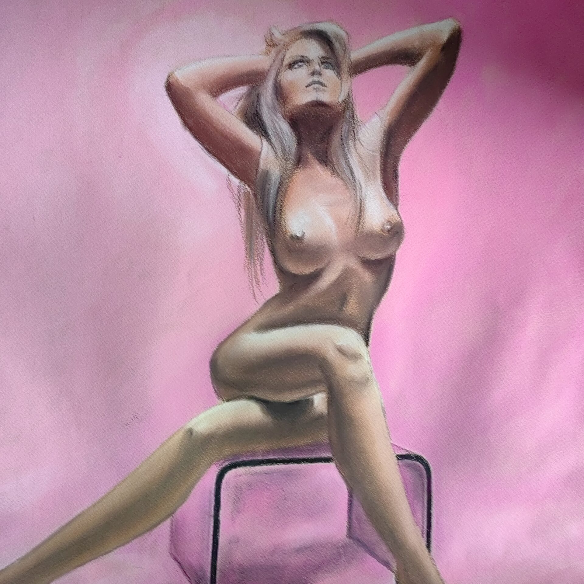Akt kobiety na różowym tle. Wymiary rysunku 50×70 cm. Technika – pastel. Cena 650zl