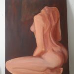 Akt kobiety malowany akrylem na płótnie o wymiarach 80 x 100 cm. Pokryty werniksem, sygnowany na rewersie.