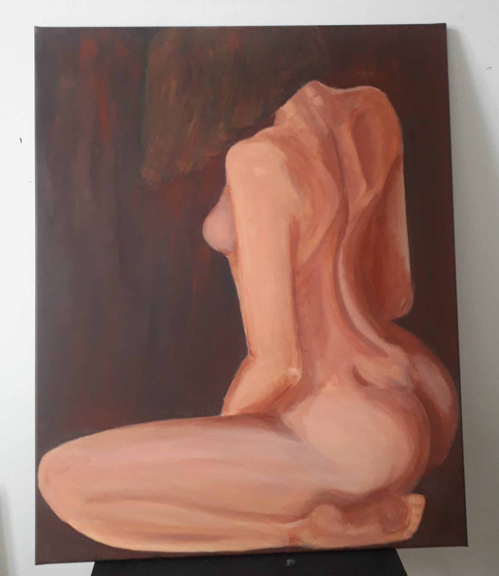 Akt kobiety malowany akrylem na płótnie o wymiarach 80 x 100 cm. Pokryty werniksem, sygnowany na rewersie.