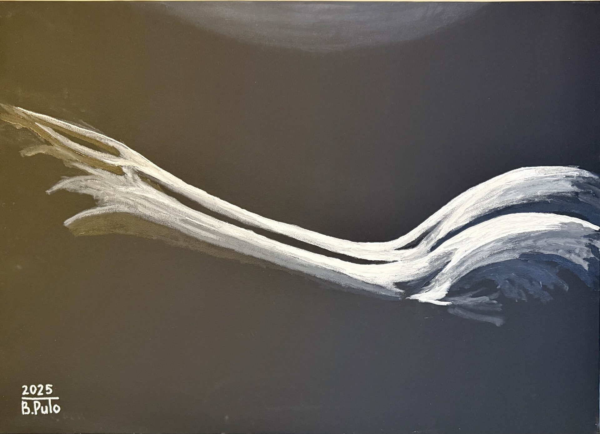 Obraz o tajemniczym klimacie, odzwierciedlone tylko te części ciała, na których kładzie się światło reflektora. Reszta ciała kobiety ginie w czerni. Bardzo eteryczne i zmysłowe dzieło, choć nie jest dosłowne. Uruchamia wyobraźnię, która podpowiada kto został namalowany i w jakich emocjach, sytuacji była kobieta .