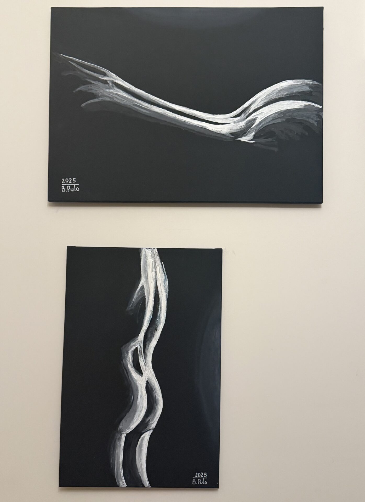 Niezwykłe unikalne abstrakcyjne dzieło – Akt kobiecy w świetle. Namalowane farbami akrylowymi profesjonalnymi na czarnym bawełnianym płótnie naciągniętym na blejtramie o rozmiarach 70×50 cm.
