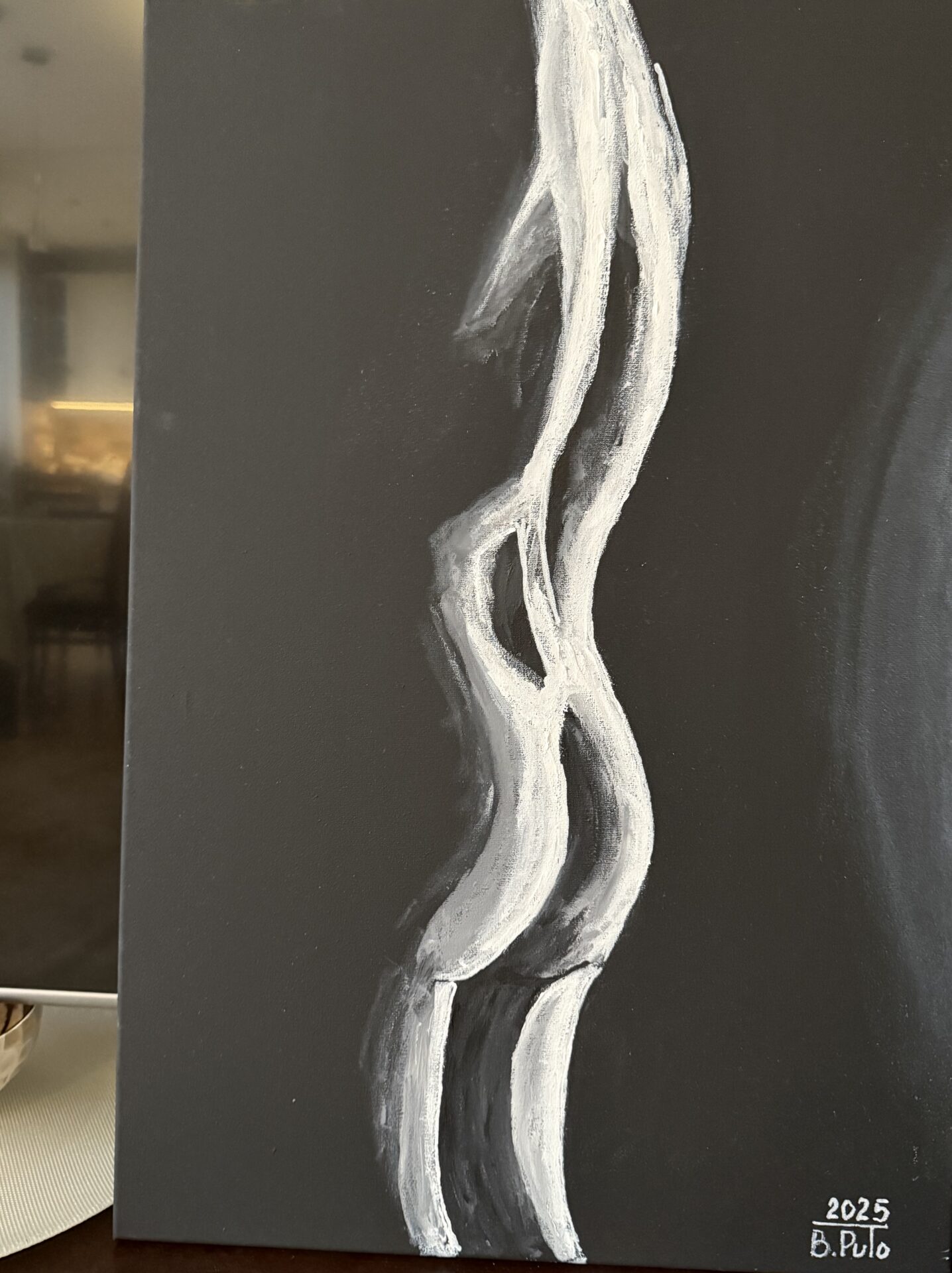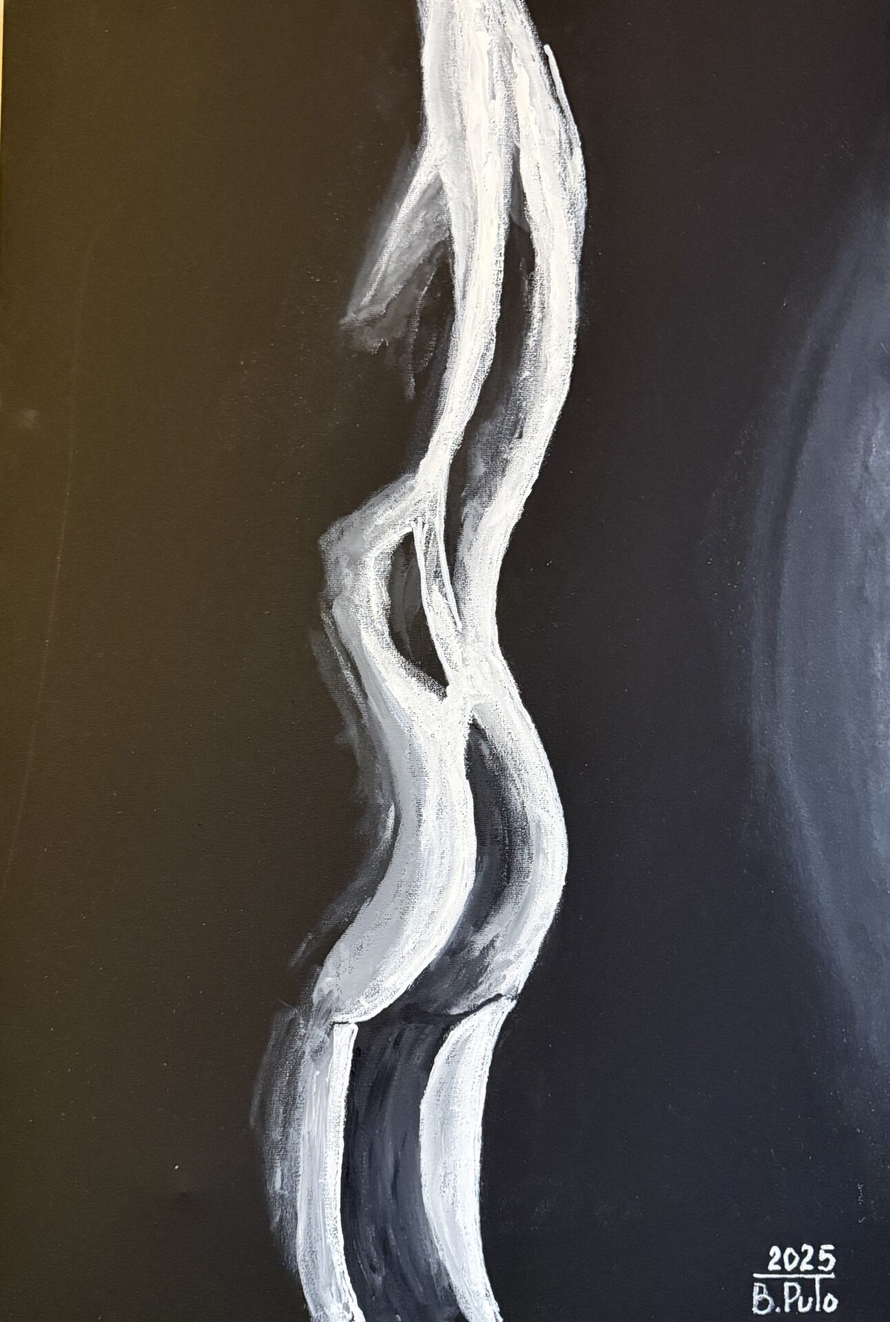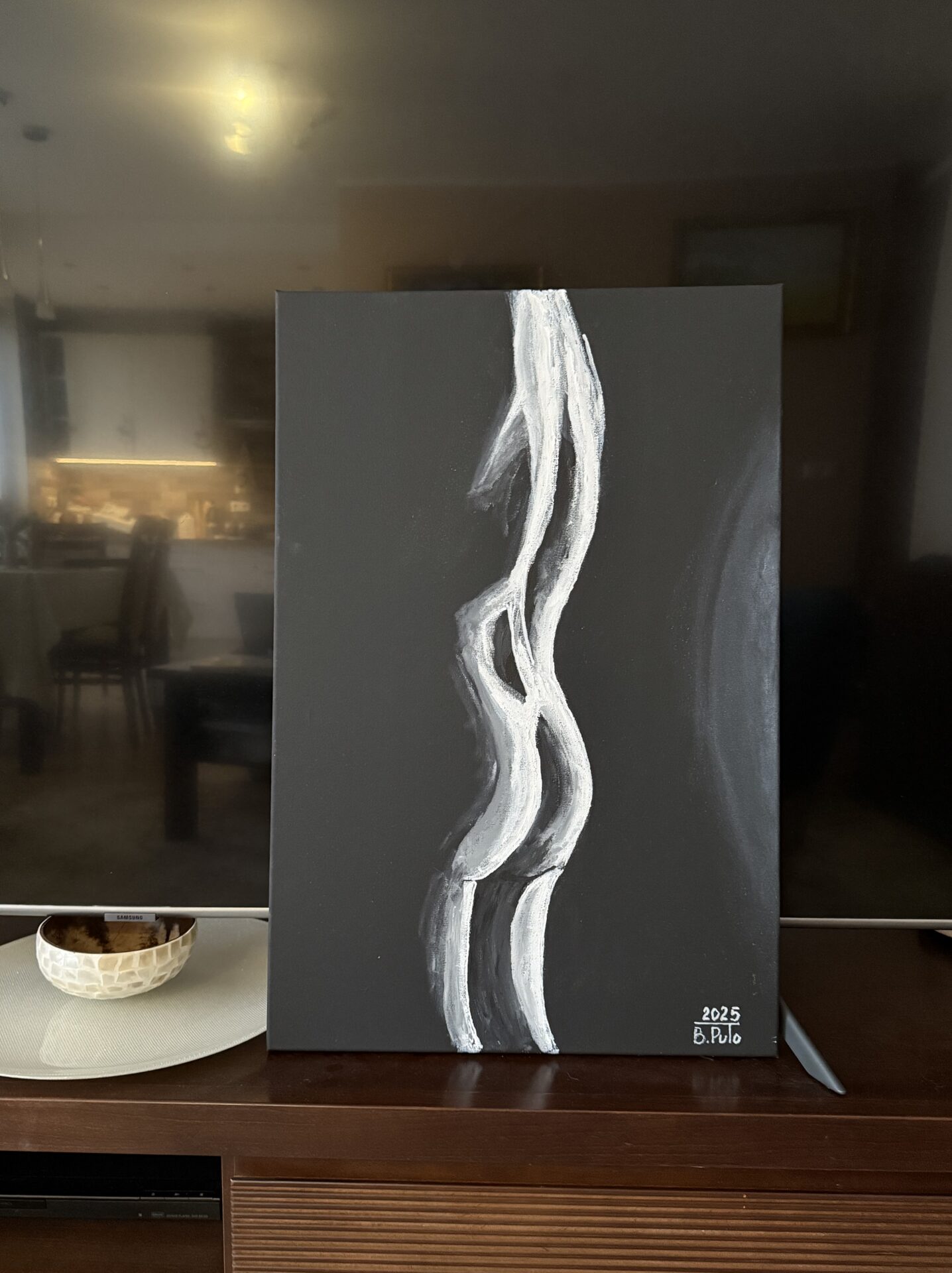 Niezwykłe unikalne abstrakcyjne dzieło – Akt męski w świetle. Namalowane farbami akrylowymi profesjonalnymi na czarnym bawełnianym płótnie naciągniętym na blejtramie o rozmiarach 60×40 cm.