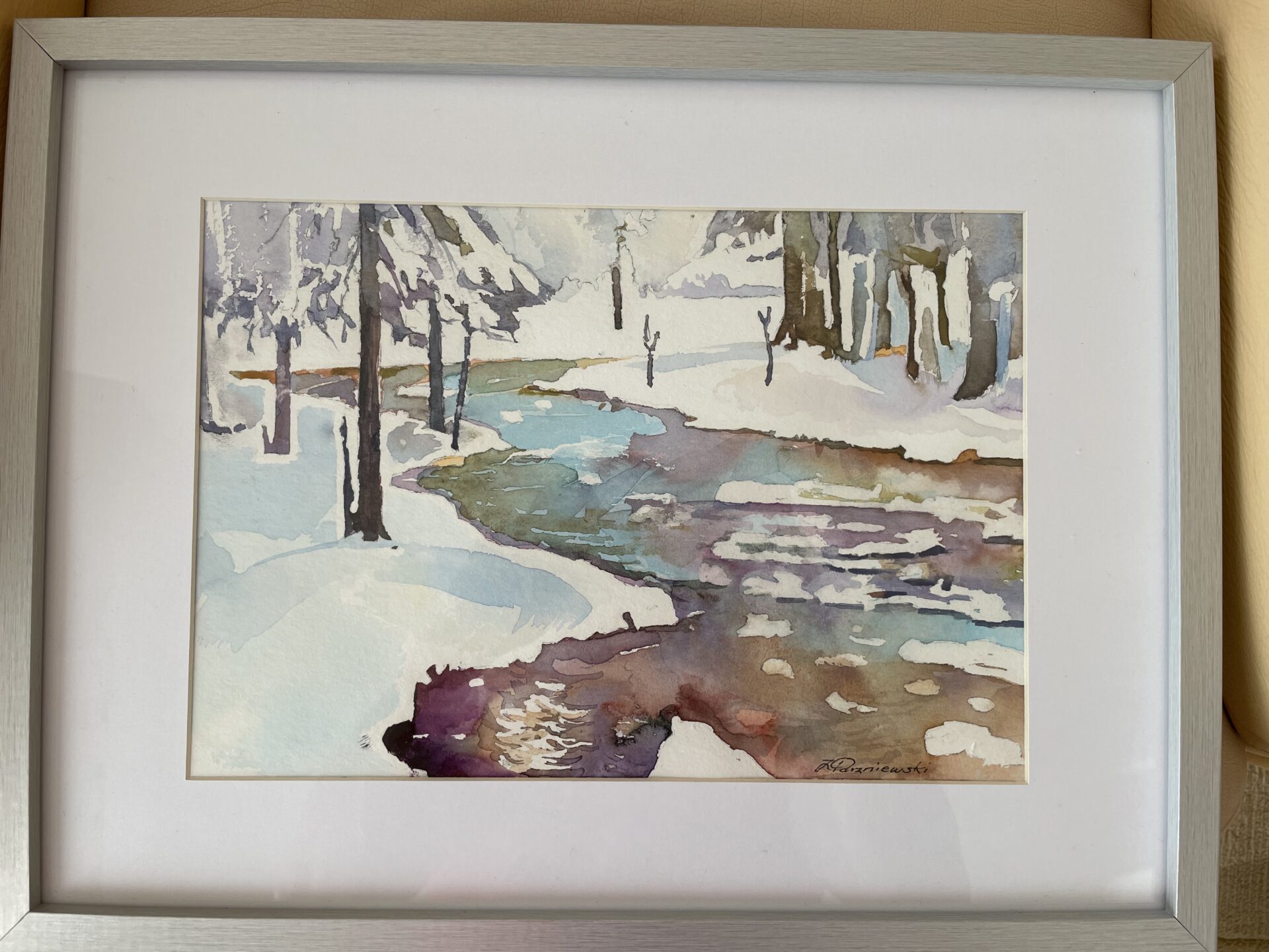 Akwarela „Potok zima”. Obraz oprawiony. Wymiar obrazu: 20 x 30. Wymiar ramy: 32 x 42.