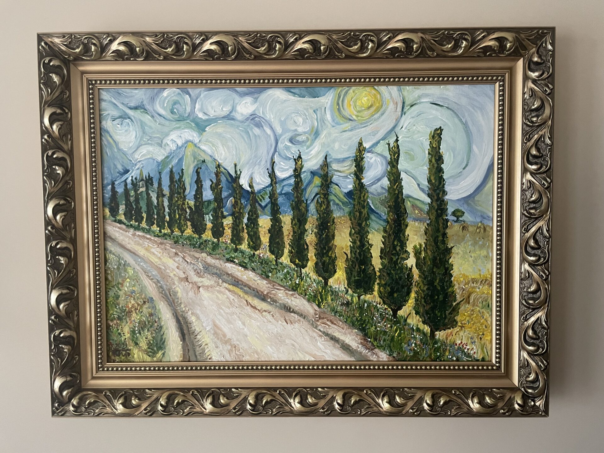 Obraz inspirowany twórczością Vincenta van Gogh’a z polskim akcentem. Chmury i przedzierające się przez nie słońce, pagórki w charakterystycznej dla Vincenta niebiesko-zielonkawej kolorystyce. W dolinie pole dojrzałej pszenicy a w oddali już zostały ustawione snopki. Na górce mała kapliczka i prowadząca do niej (na pierwszym planie ) piaskowa droga (w stylu Chełmońskiego) a przy niej szpaler cisów.