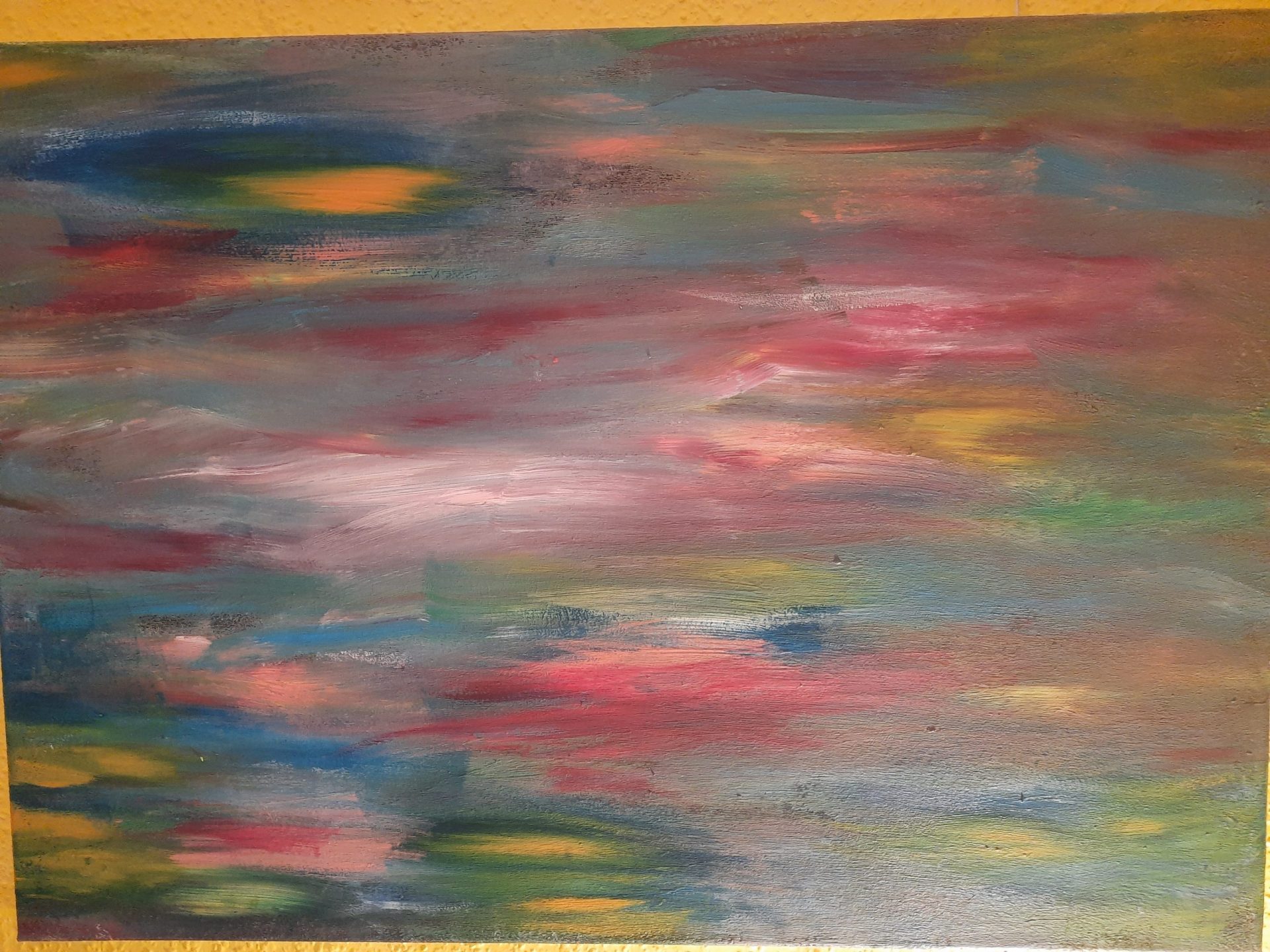Akryl na płótnie, obraz przedstawia mgławice, kolory tęczy symbolizują nadzieję i piękno tego co nieznane.