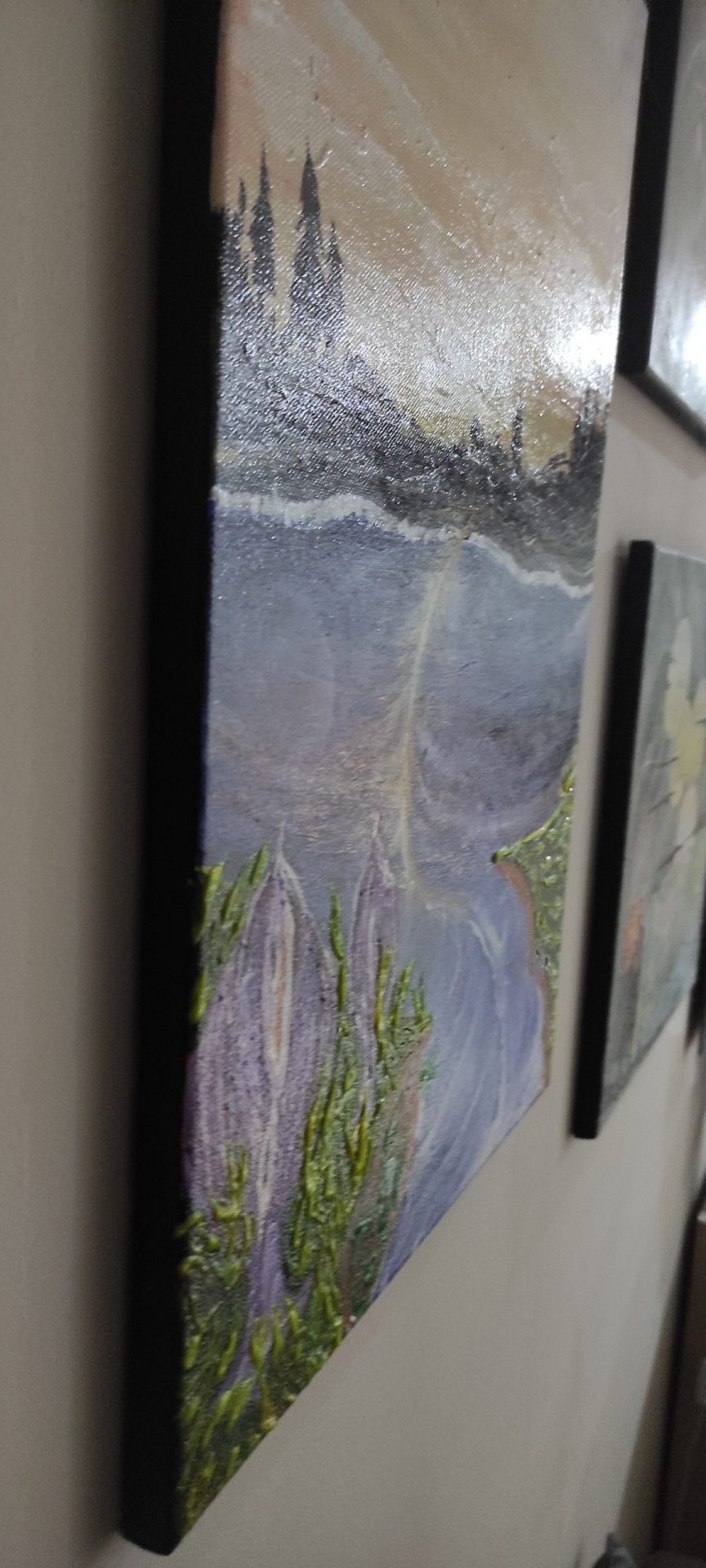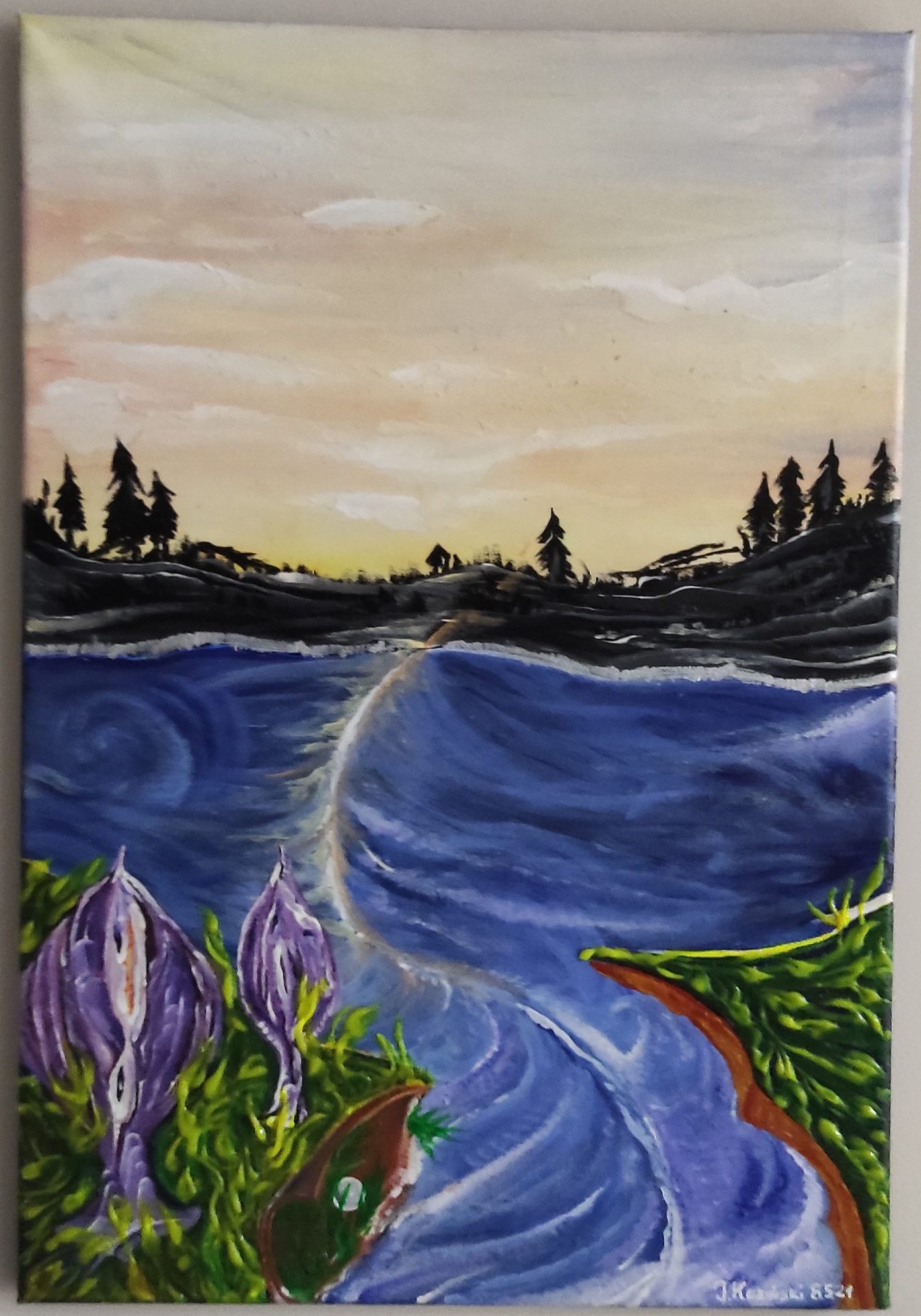 Obraz malowany ręcznie farbą akrylową pokryty werniksem……………………………….