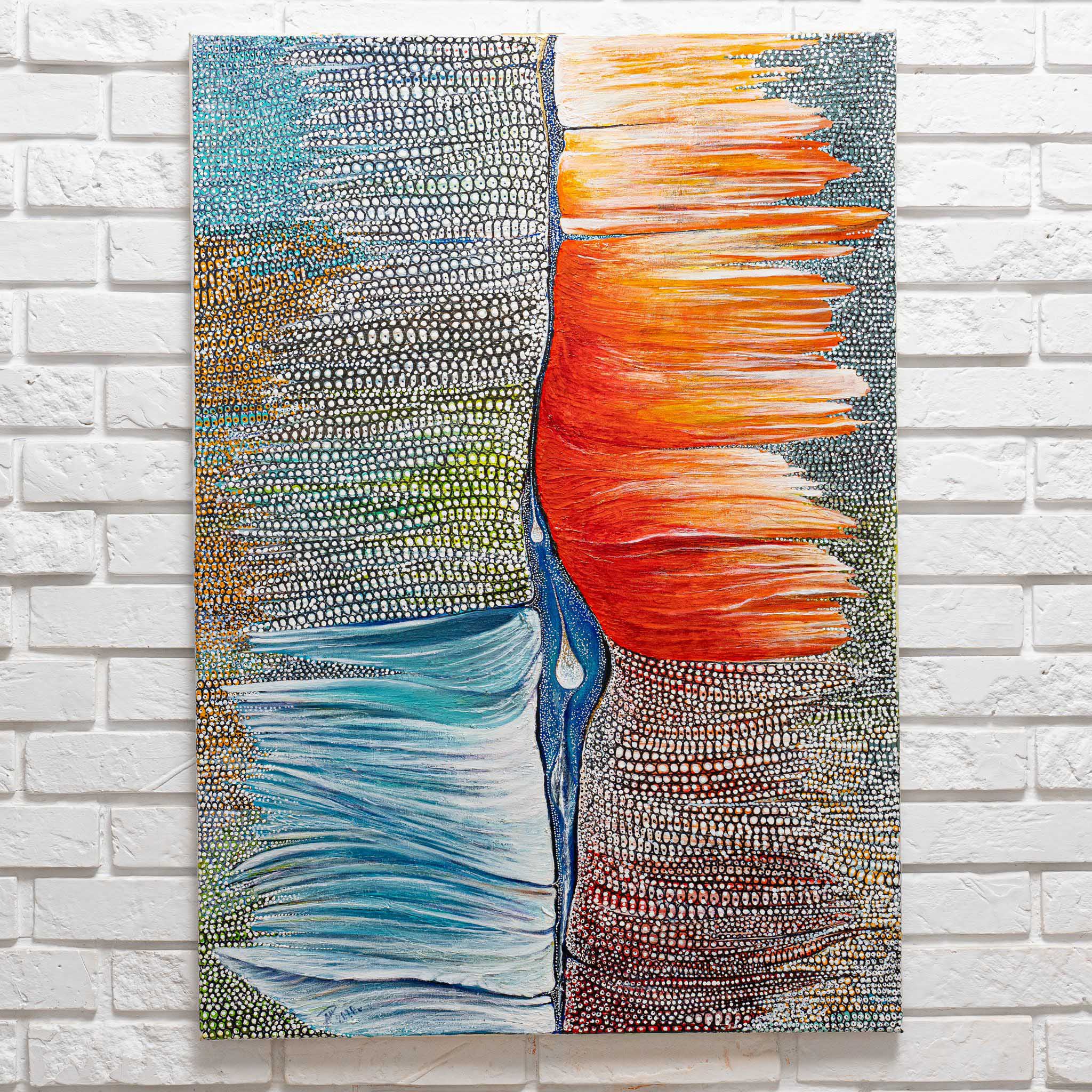 Obraz zatytułowany „Anastasis” przenosi nas w świat odrodzenia i transformacji, ukazując symfonię barw i form, które przenikają się i łączą w jedną, dynamiczną kompozycję. W centrum tej wizji, niczym oś życia, przebiega pionowa linia, dzieląca przestrzeń na dwie kontrastujące połowy – jedna pulsuje gorącymi odcieniami pomarańczu i czerwieni, druga zaś spowita jest chłodnym błękitem i zielenią.