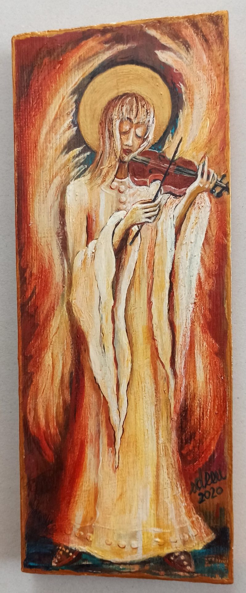 IKONA AUTORSKA. MALOWANA FARBĄ AKRYLOWĄ NA DESCE SOSNOWEJ. POKRYTA KILKOMA WARSTWAMI SZELAKU.