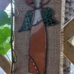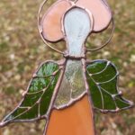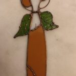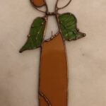 Anioł wykonany ręcznie ze szkła witrażowego barwionego w masie oprawionego w miedź i cynę. Szata i włosy ze szkła kryjącego w kolorze cynamonu, skrzydła w kształcie liści ze szkła przejrzystego, ciemnozielonego. Cynowa oprawa pokryta patyną o odcieniu starej miedzi. Umieszczony w miescu, które umożliwi przenikanie światła słonecznego lub światła świec, będzie stanowił klimatyczny dodatek do wystroju wnętrza.