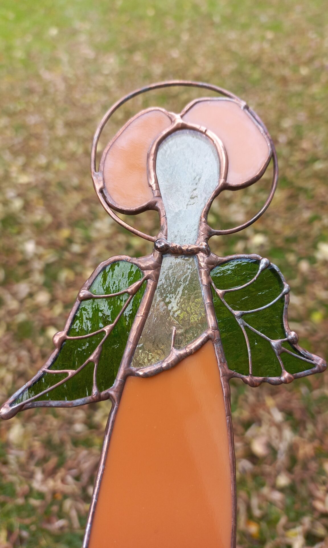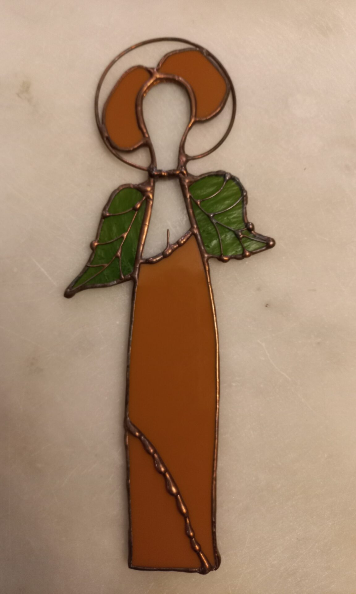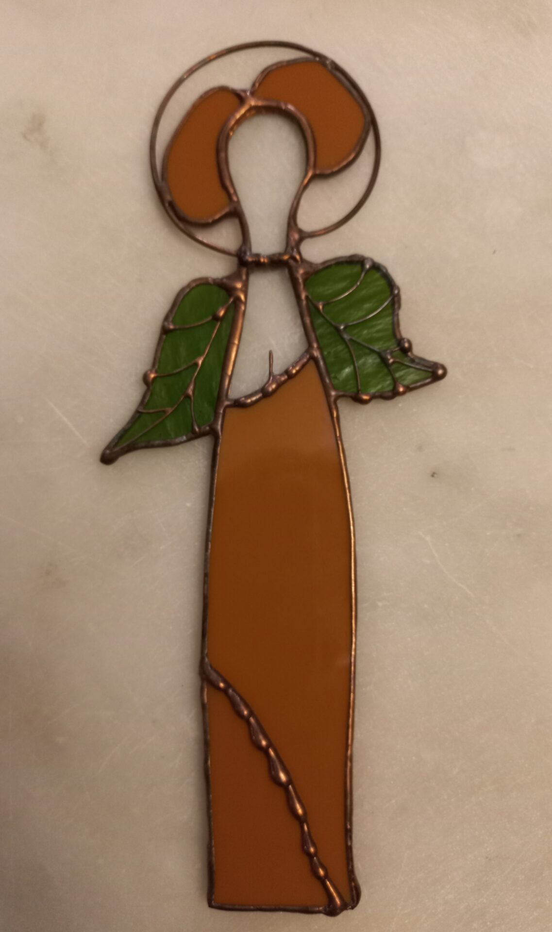 Anioł wykonany ręcznie ze szkła witrażowego barwionego w masie oprawionego w miedź i cynę. Szata i włosy ze szkła kryjącego w kolorze cynamonu, skrzydła w kształcie liści ze szkła przejrzystego, ciemnozielonego. Cynowa oprawa pokryta patyną o odcieniu starej miedzi. Umieszczony w miescu, które umożliwi przenikanie światła słonecznego lub światła świec, będzie stanowił klimatyczny dodatek do wystroju wnętrza.