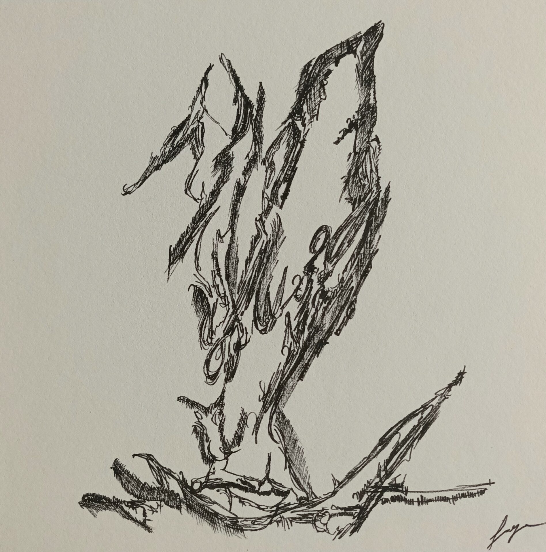 Anioł- abstrakcja na papierze 20cm/20 cm wykonana piórem. Całość emanuje tajemniczością sugerując obecność anielskiej postaci bez dosłownego jej ukazania.