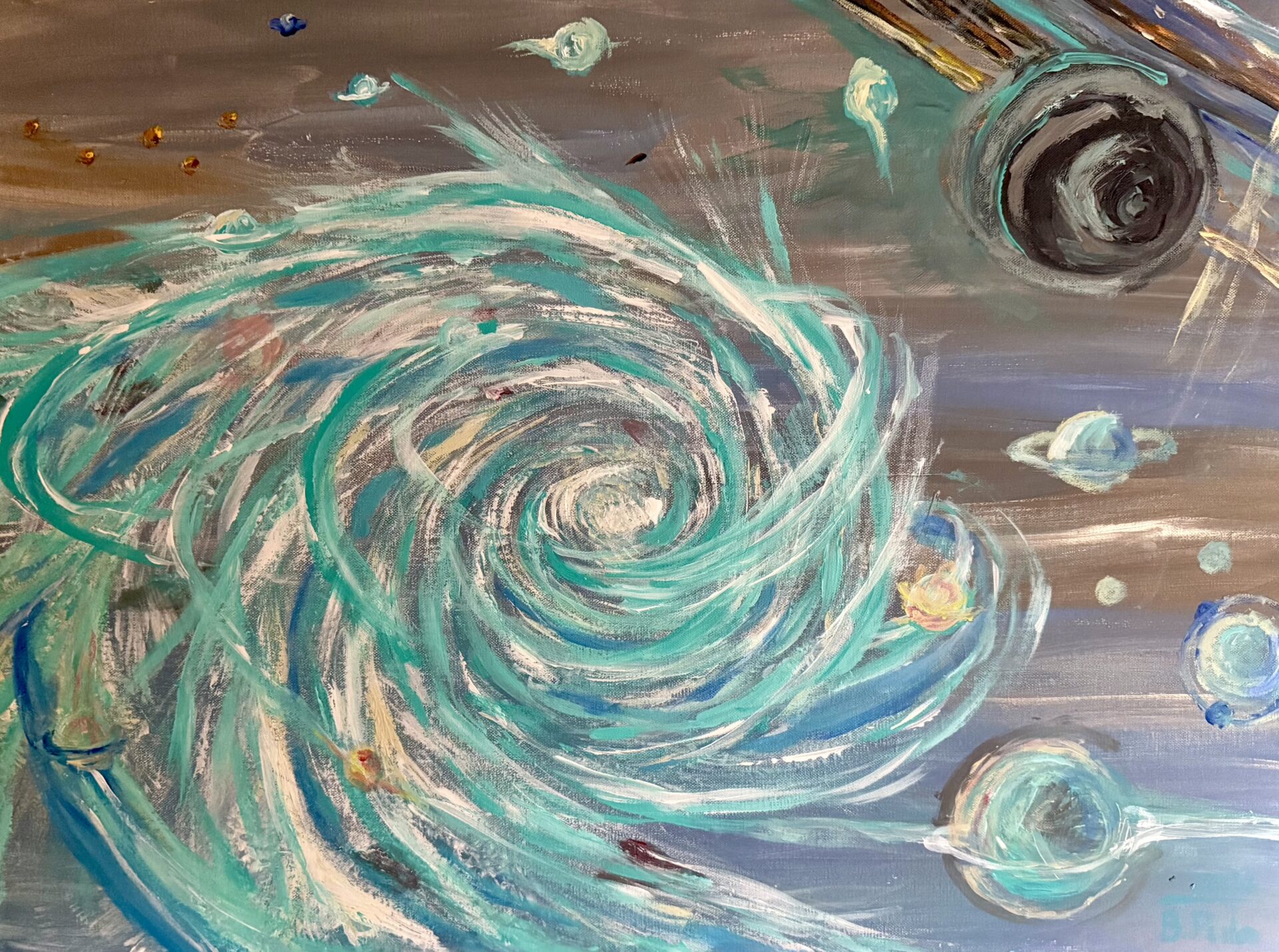 Słowa kluczowe: Anioł, kosmos, przestrzeń, planeta, gwiazda, astronomia, kometa, niebo, turkus, szary, nowoczesny, abstrakcja, akryl