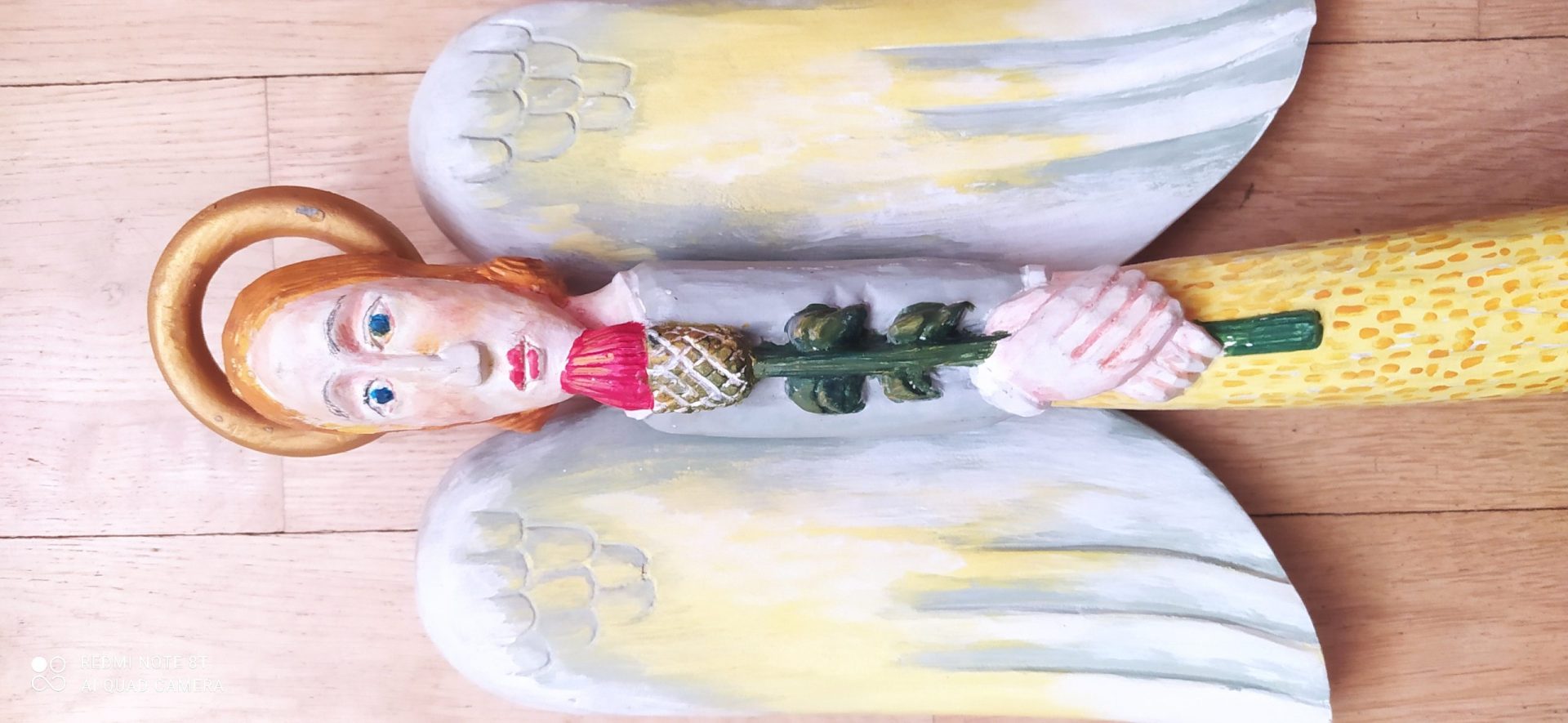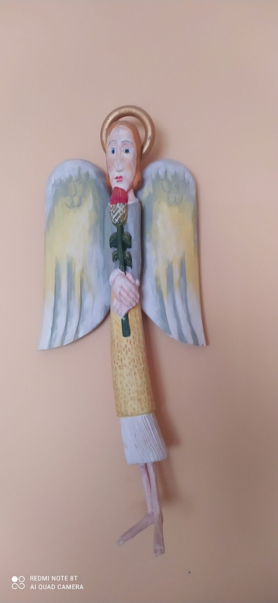 Rzeźba w drewnie Henryka Patejuka „Anioł z kwiatkiem” z roku 2013. Przybliżone wymiary wysokość 50 cm, szerokość 20 cm.