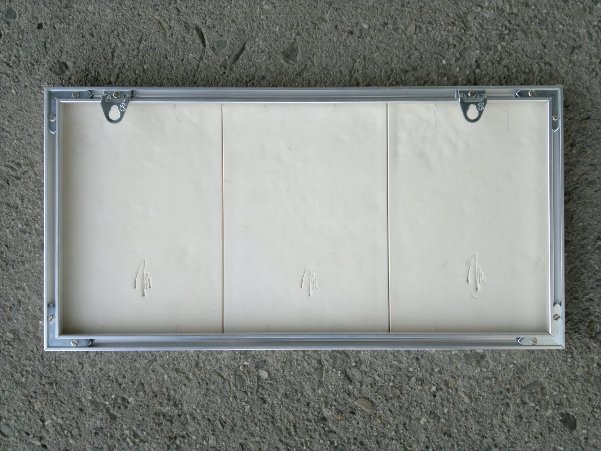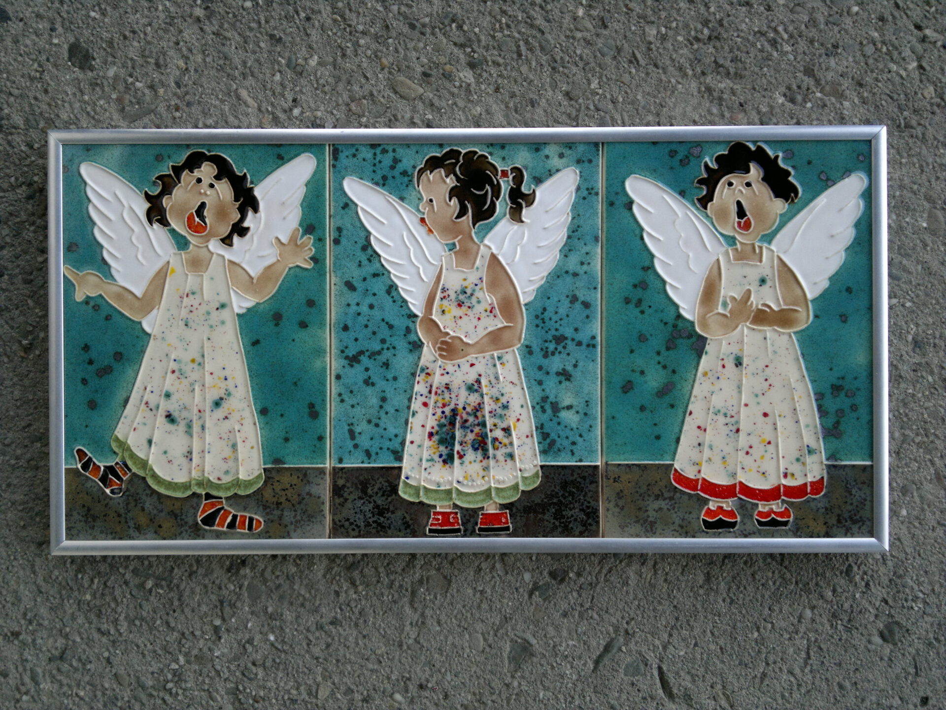 Trzy płytki ceramiczne , wym. – 18 x 12 cm , ręcznie malowane kolorowymi szkliwami . Oprawione w aluminiową ramkę .