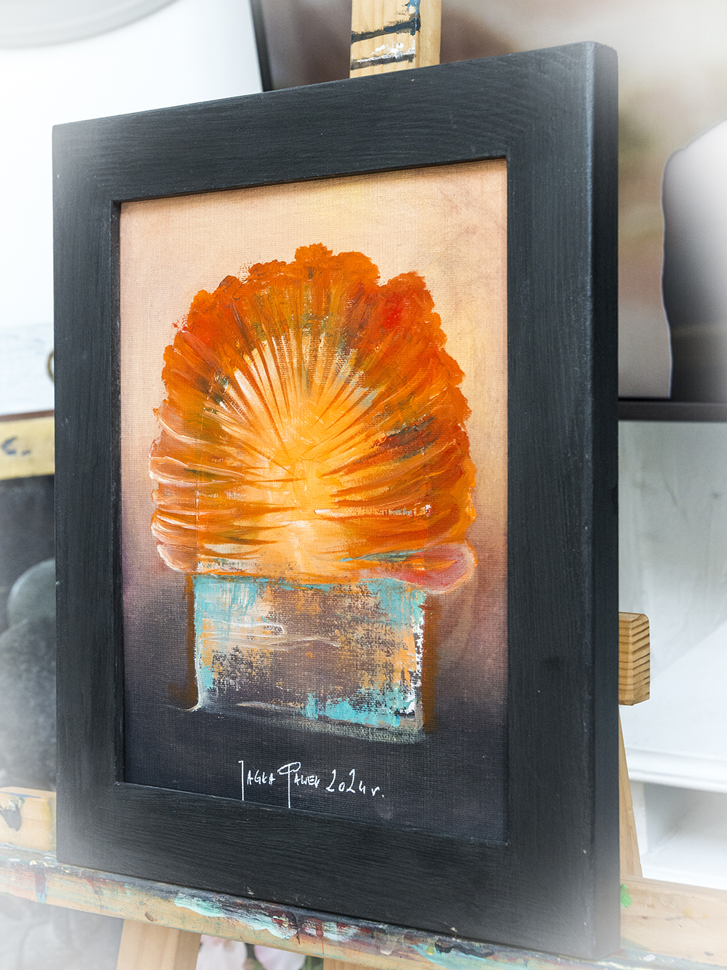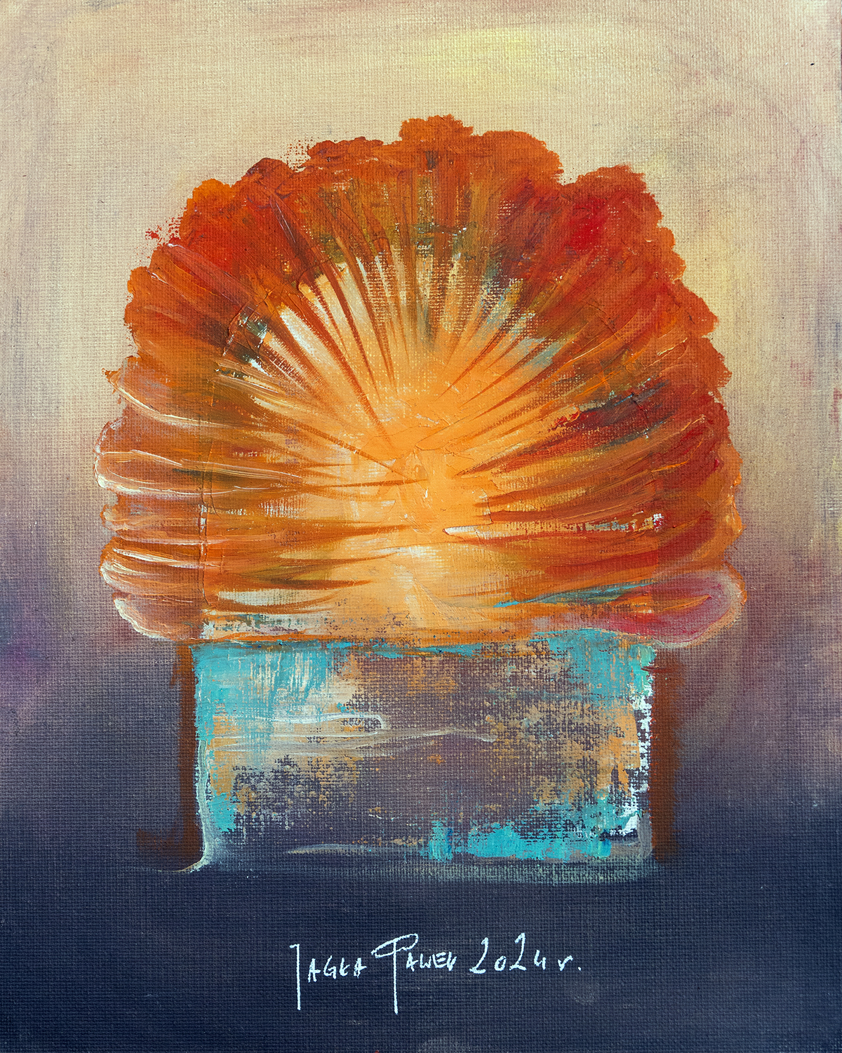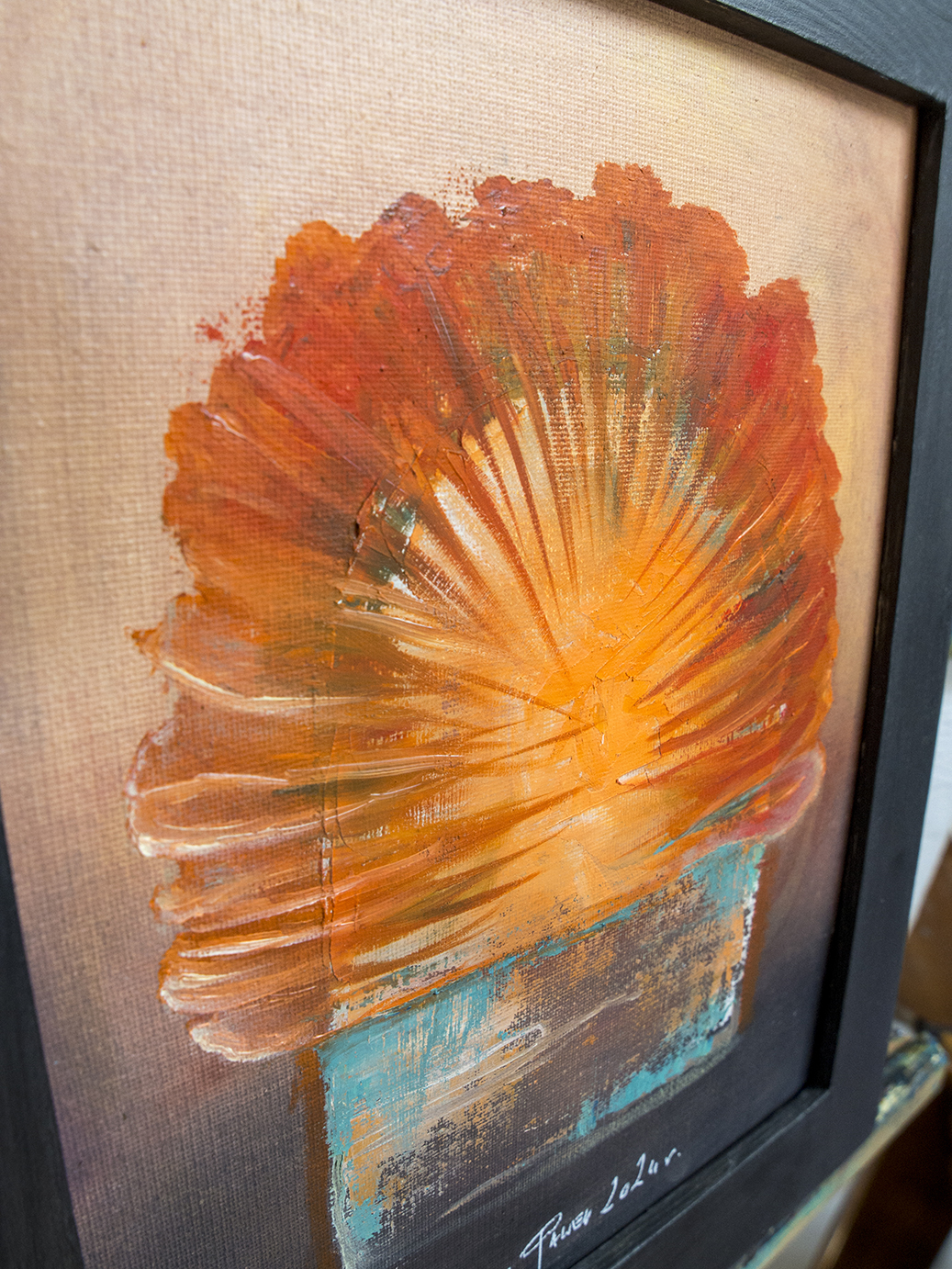 Obraz na płycie oklejonej płótnem bawełnianym 290 gr / m2 , całość oprawiona w drewnianą ramkę 39 x 29 cm Farby olejne Renesans wymiar samej pracy 24 x 30 cm Praca sygnowana z tyłu i przodu Certyfikat autentyczności