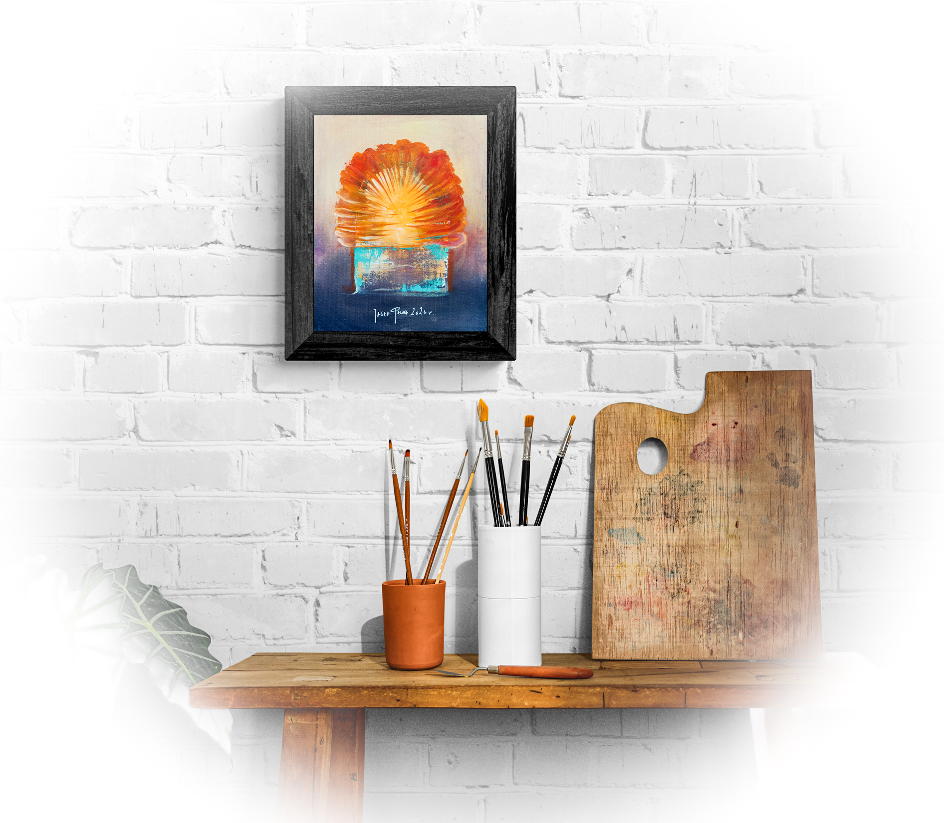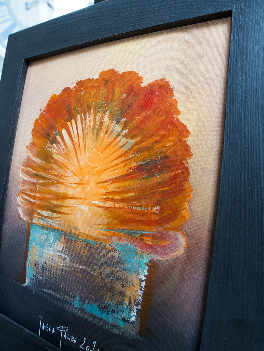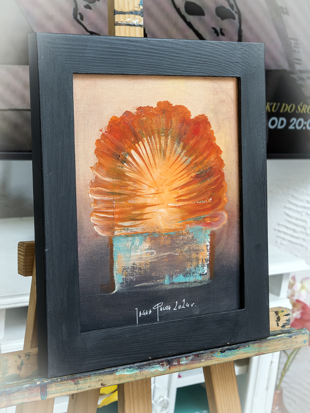 Obraz na płycie oklejonej płótnem bawełnianym 290 gr / m2 , całość oprawiona w drewnianą ramkę 39 x 29 cm Farby olejne Renesans wymiar samej pracy 24 x 30 cm Praca sygnowana z tyłu i przodu Certyfikat autentyczności
