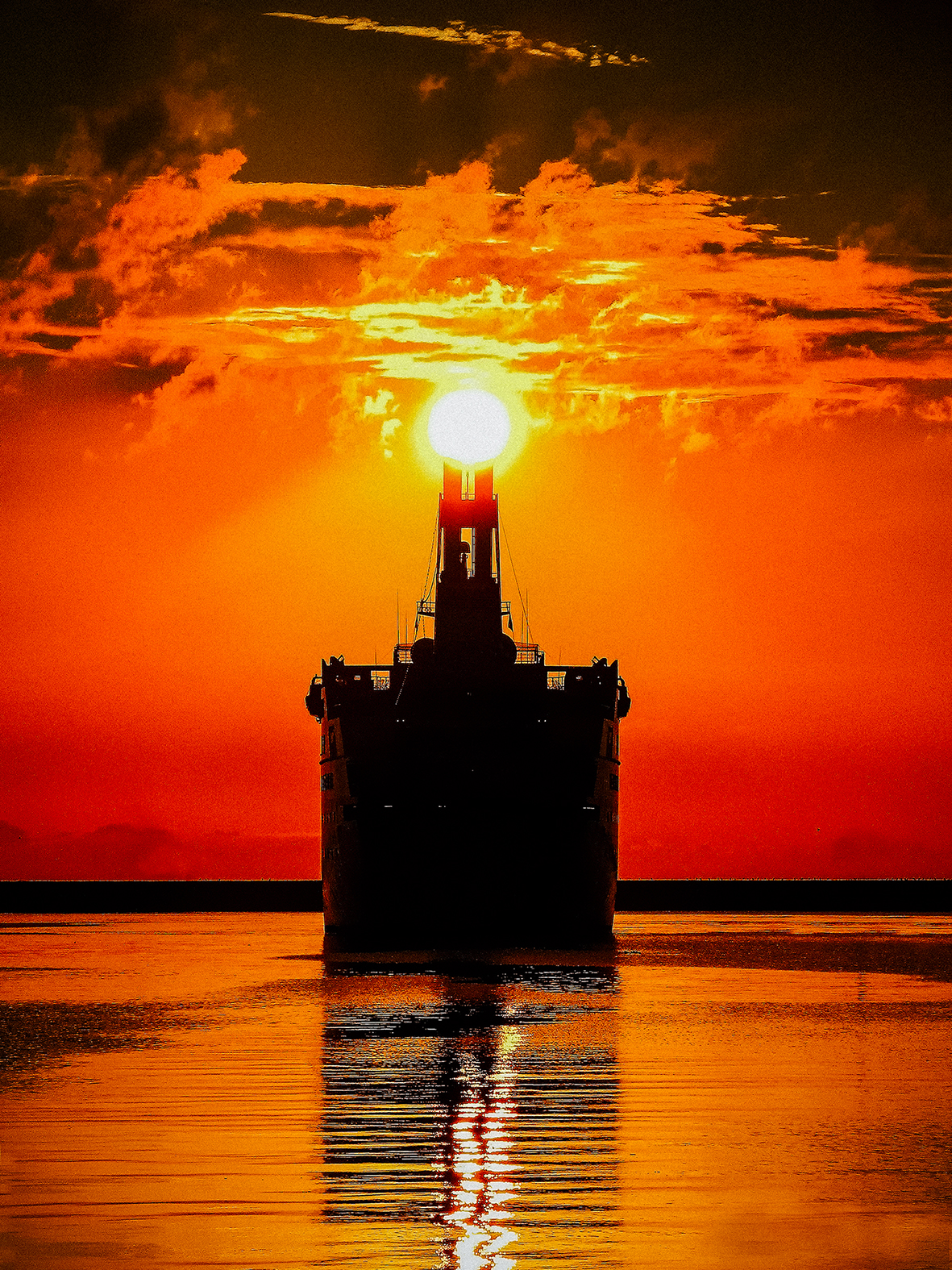 Astor, nazwa statku pasażerskiego „wycieczkowca”, którego sfotografowałem w 2008 roku o wschodzie słońca tuż przed godziną 6.00 rano, Canon S5IS, statyw. Zależało mi na wyczekaniu momentu, gdzie wschodzące słońce znajdzie się w osi komina, wycieczkowiec opuszczał w tym momencie Nabrzeże Francuskie Gdyńskiego portu.