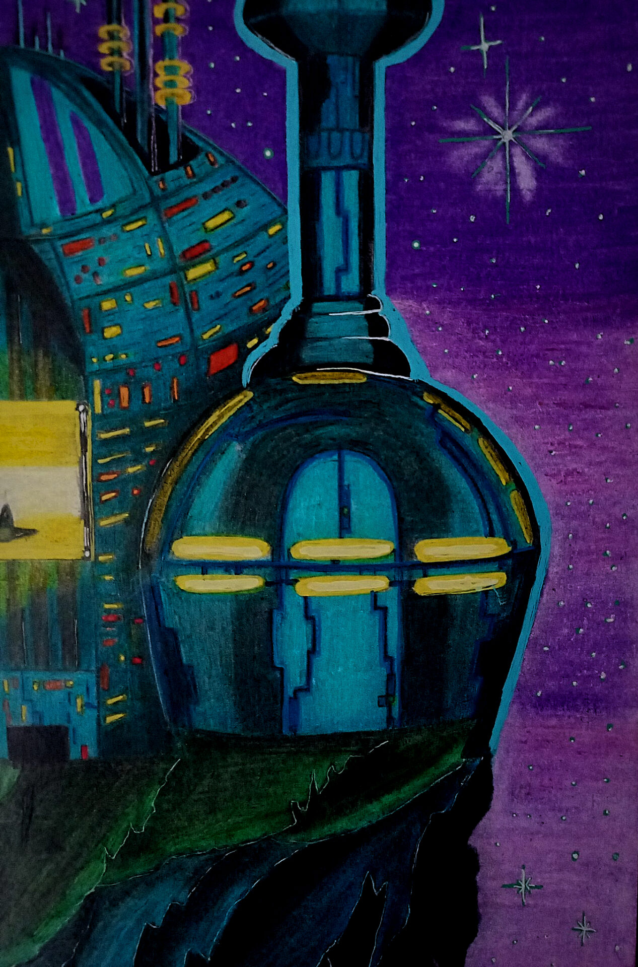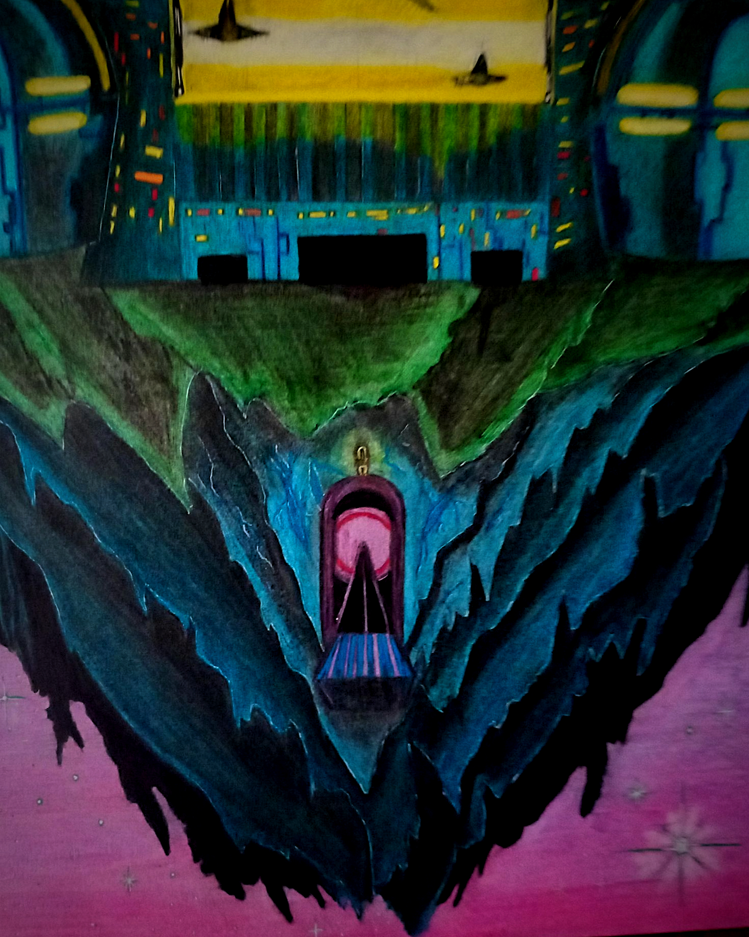 Rysunek wykonany kllkoma technikami, głównie przy użyciu kredek ołówkowych na kartonie.
