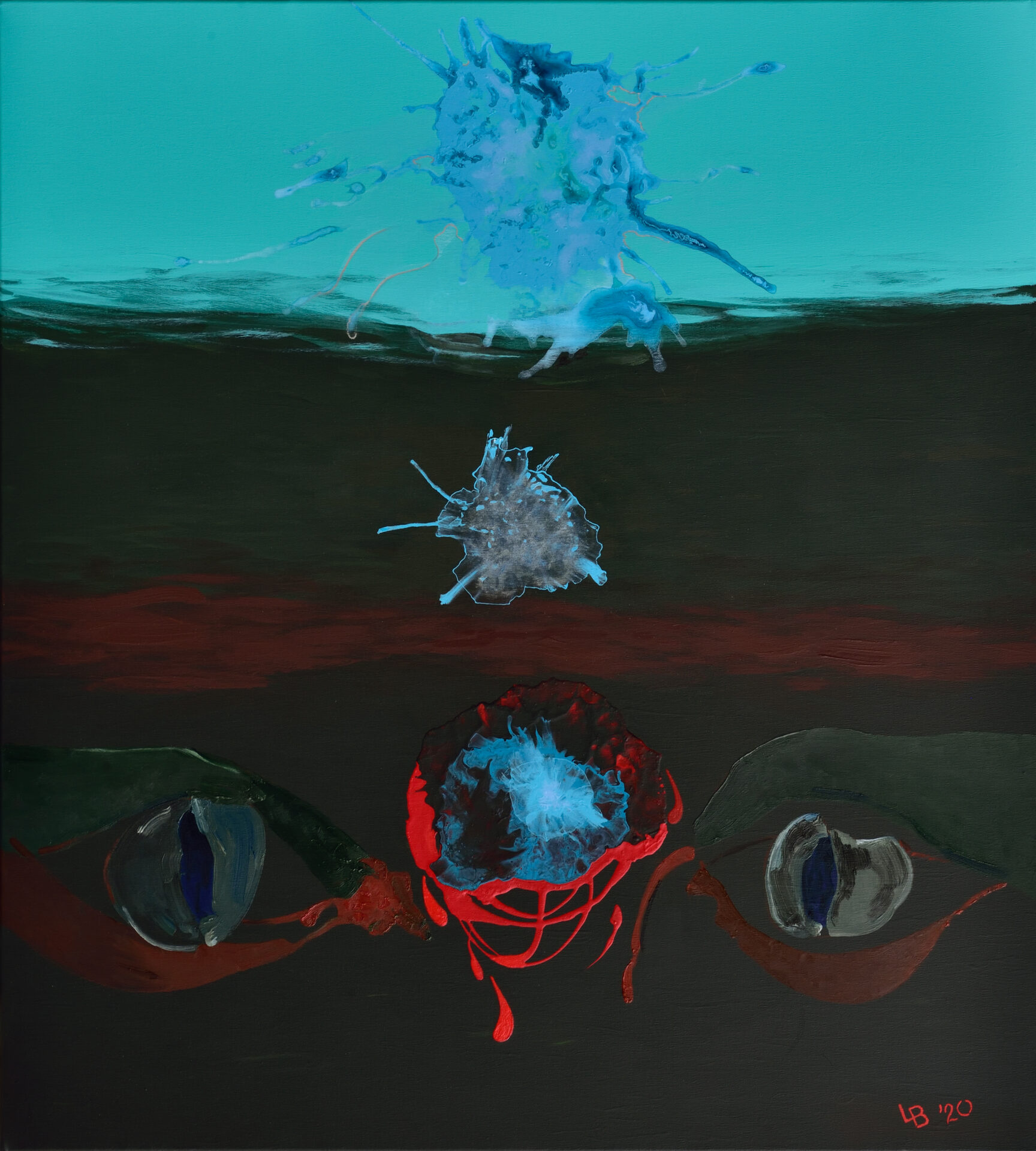 Obraz powstał pod działaniem nękającej nas pandemii. Abstrakcyjna interpretacja olbrzymiego i tajemniczego zagrożenia.