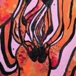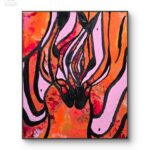 Obraz eksploduje kolorami, głównie pomarańczowym, różowym i czarnym, tworząc dynamiczną kompozycję pełną zawirowań i kontrastów. Linie przypominające kształty organiczne wydają się tańczyć po płótnie, jakby były żywe. Ta swoboda formy nadaje całości abstrakcyjny charakter. Reminds me of a dance party! Artysta posługuje się grubymi, zdecydowanymi pociągnięciami pędzla, co dodaje ekspresji i głębi. Na powierzchni widoczne są ślady użycia techniki impasto, które tworzą teksturę i dodają obrazu materialności.