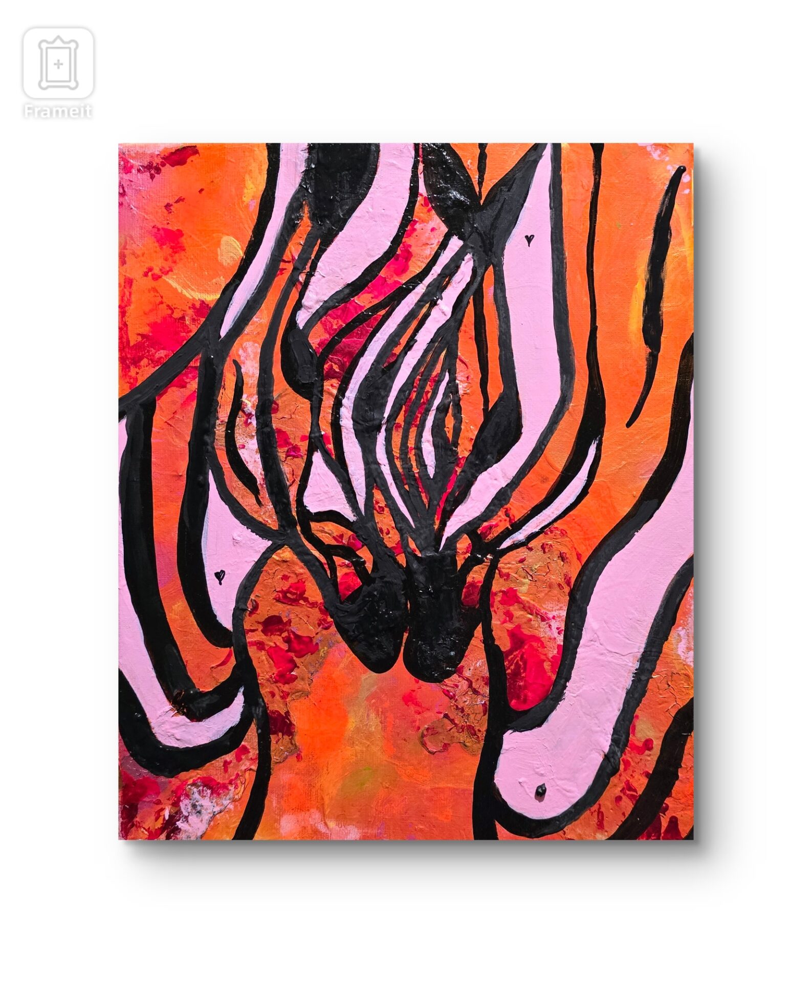 Obraz eksploduje kolorami, głównie pomarańczowym, różowym i czarnym, tworząc dynamiczną kompozycję pełną zawirowań i kontrastów. Linie przypominające kształty organiczne wydają się tańczyć po płótnie, jakby były żywe. Ta swoboda formy nadaje całości abstrakcyjny charakter. Reminds me of a dance party! Artysta posługuje się grubymi, zdecydowanymi pociągnięciami pędzla, co dodaje ekspresji i głębi. Na powierzchni widoczne są ślady użycia techniki impasto, które tworzą teksturę i dodają obrazu materialności.