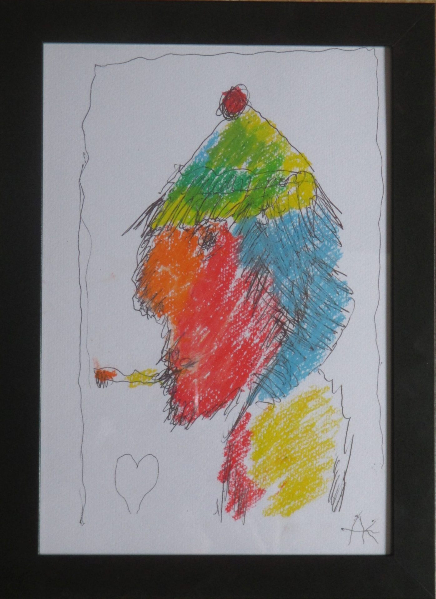Rysunek na papierze, kredka, format A4 w oprawie. Głowa palacza.