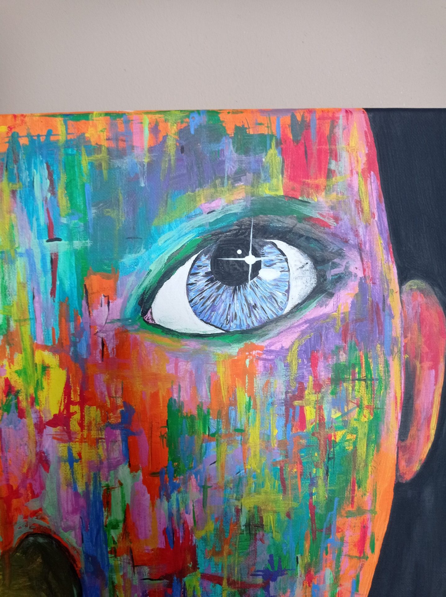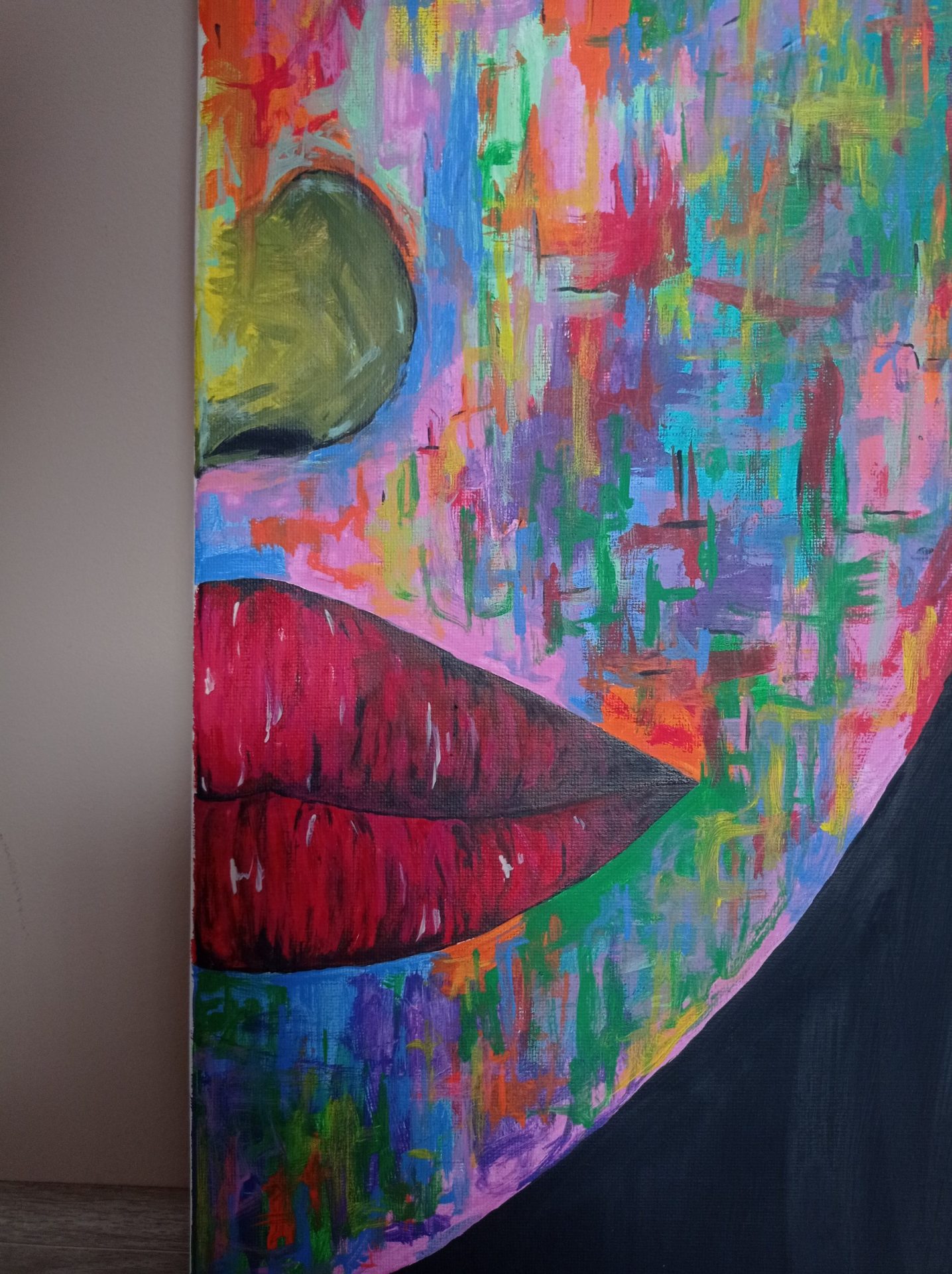Obraz namalowany na podobraziu o rozmiarach 40×60, farbami akrylowymi. Boki niezamlowne, obraz nie jest zabezpieczony.