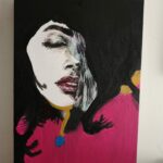 Obraz przedstawia kobietę z czarnymi włosami, ubrana w różowo-czerwona bluzkę. Rewelacyjnie prezentuje się na jasnej ścianie. I nie tylko 🙂