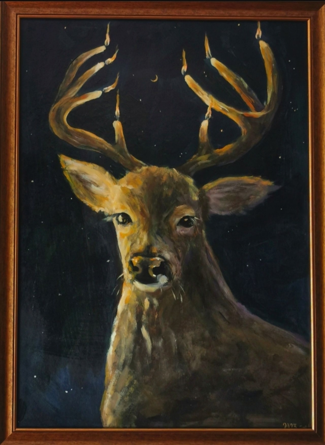Jeleń z płonącym porożem. Inspiracja naturą, tajemniczością lasu o zmroku jak i również motywem snu.