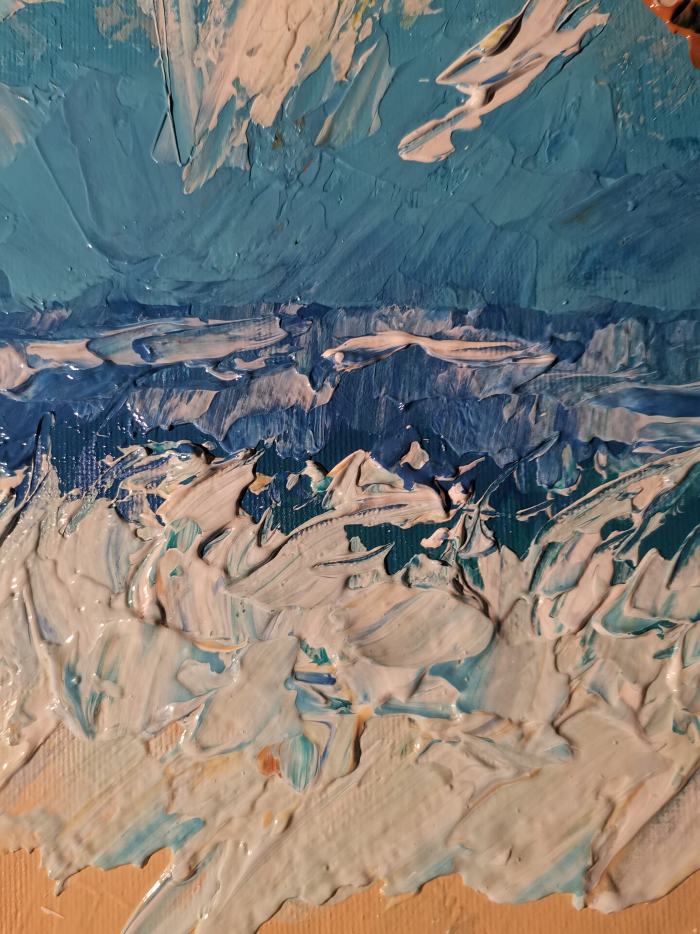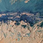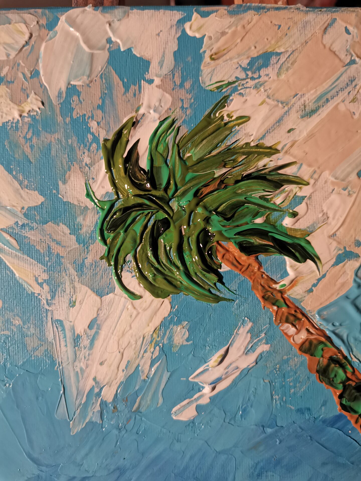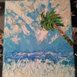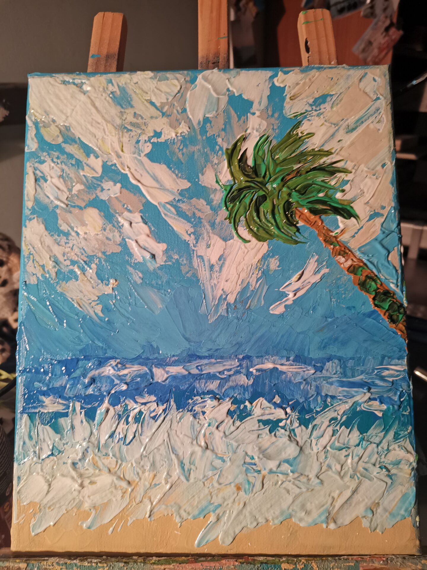 Obraz został namalowany farbami akrylowymi na podobraziu malarskim. Ma zamalowane boki, został zabezpieczony werniksem.