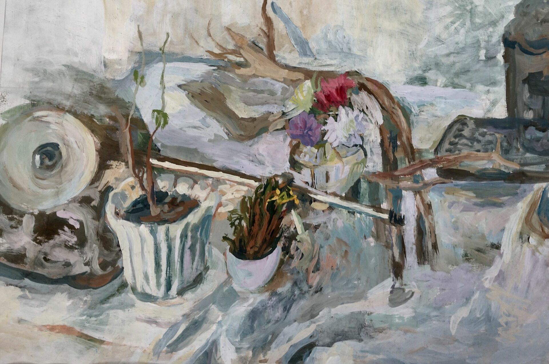Malowana w technice tempery, jasna kompozycja, z bukietami roślin i kwiatów. W anty-ramie ze szkła lub pleksi o wymiarze 70/50 cm