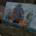 Niezwykłej urody obraz namalowany w technice olejnej, przedstawiający morską bitwę pomiędzy żaglowcami. Całość robi ogromne wrażenie estetyczne i ma ponadczasowy styl. Nadaje się do wielu wnętrz.
