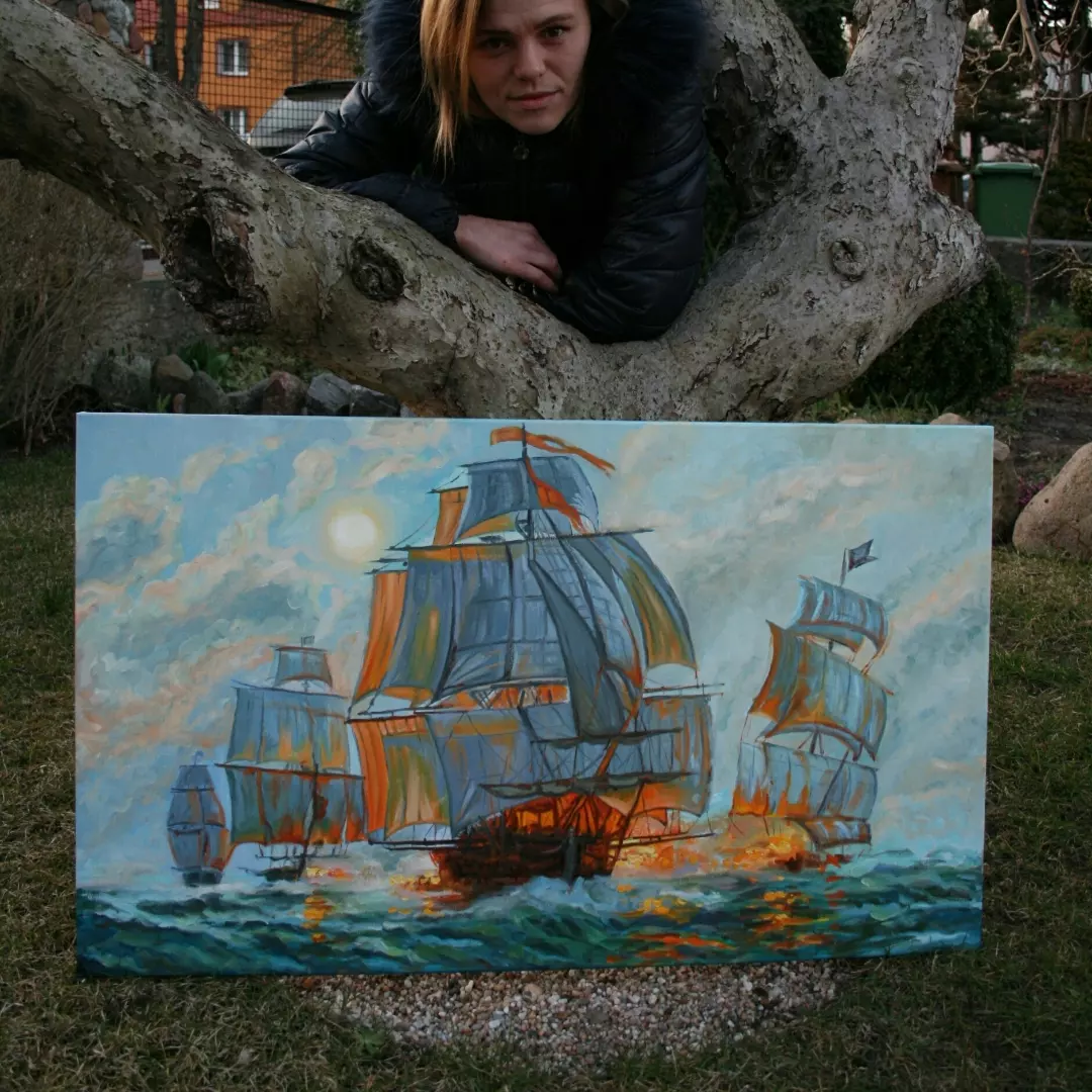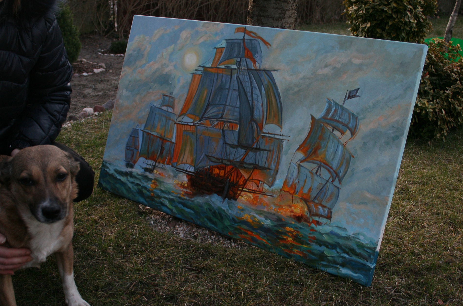 Niezwykłej urody obraz namalowany w technice olejnej, przedstawiający morską bitwę pomiędzy żaglowcami. Całość robi ogromne wrażenie estetyczne i ma ponadczasowy styl. Nadaje się do wielu wnętrz.