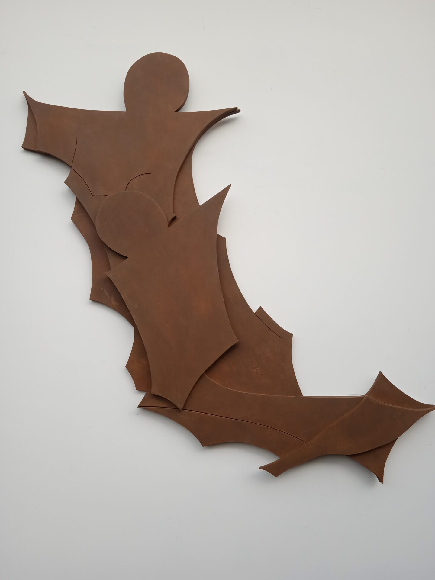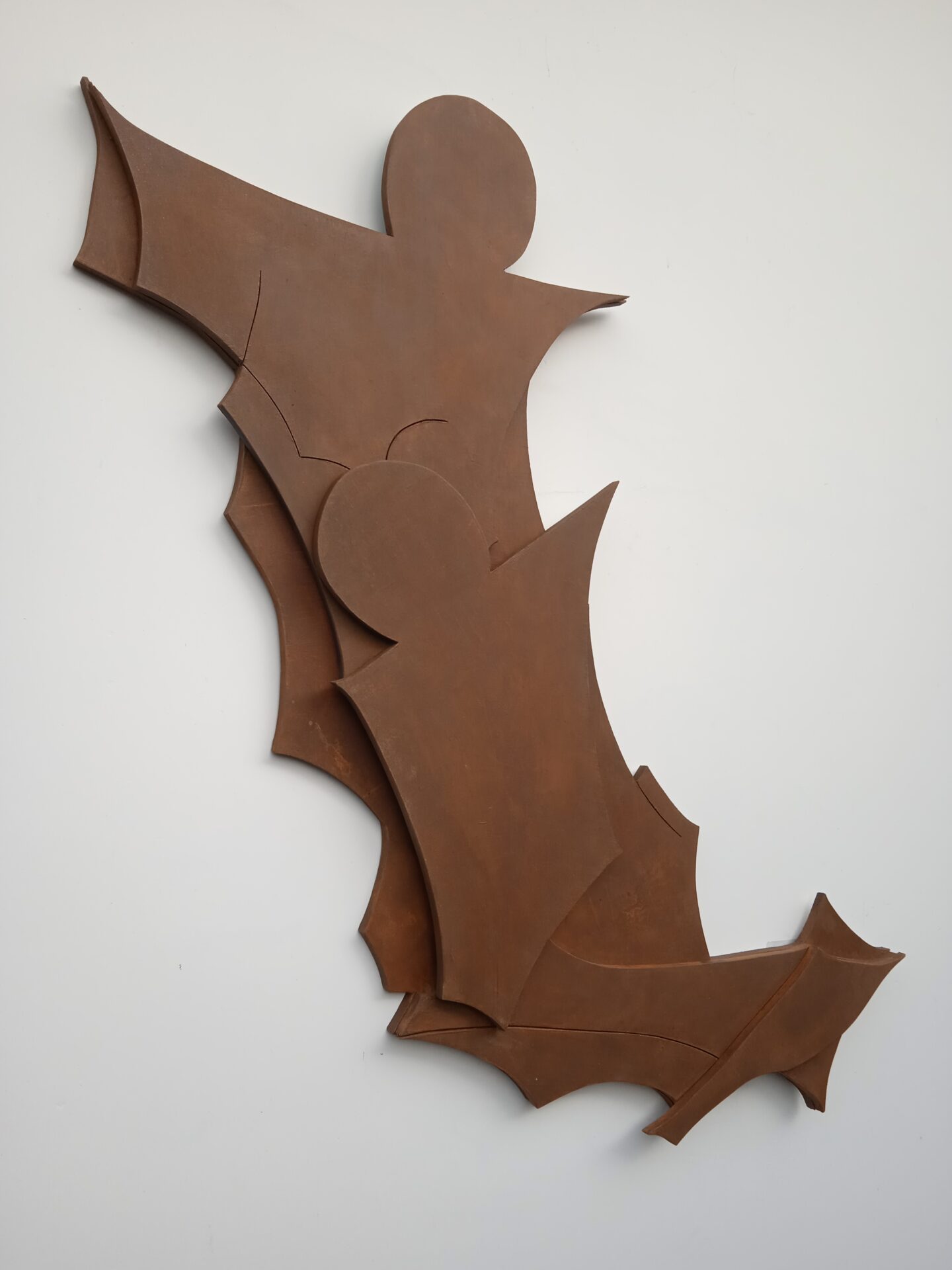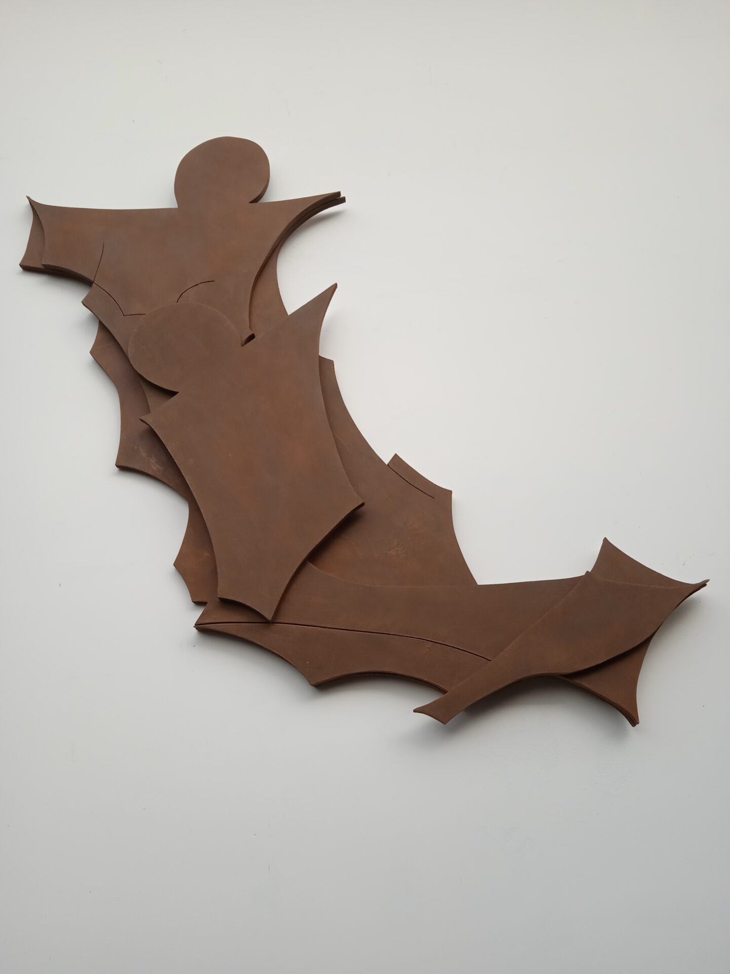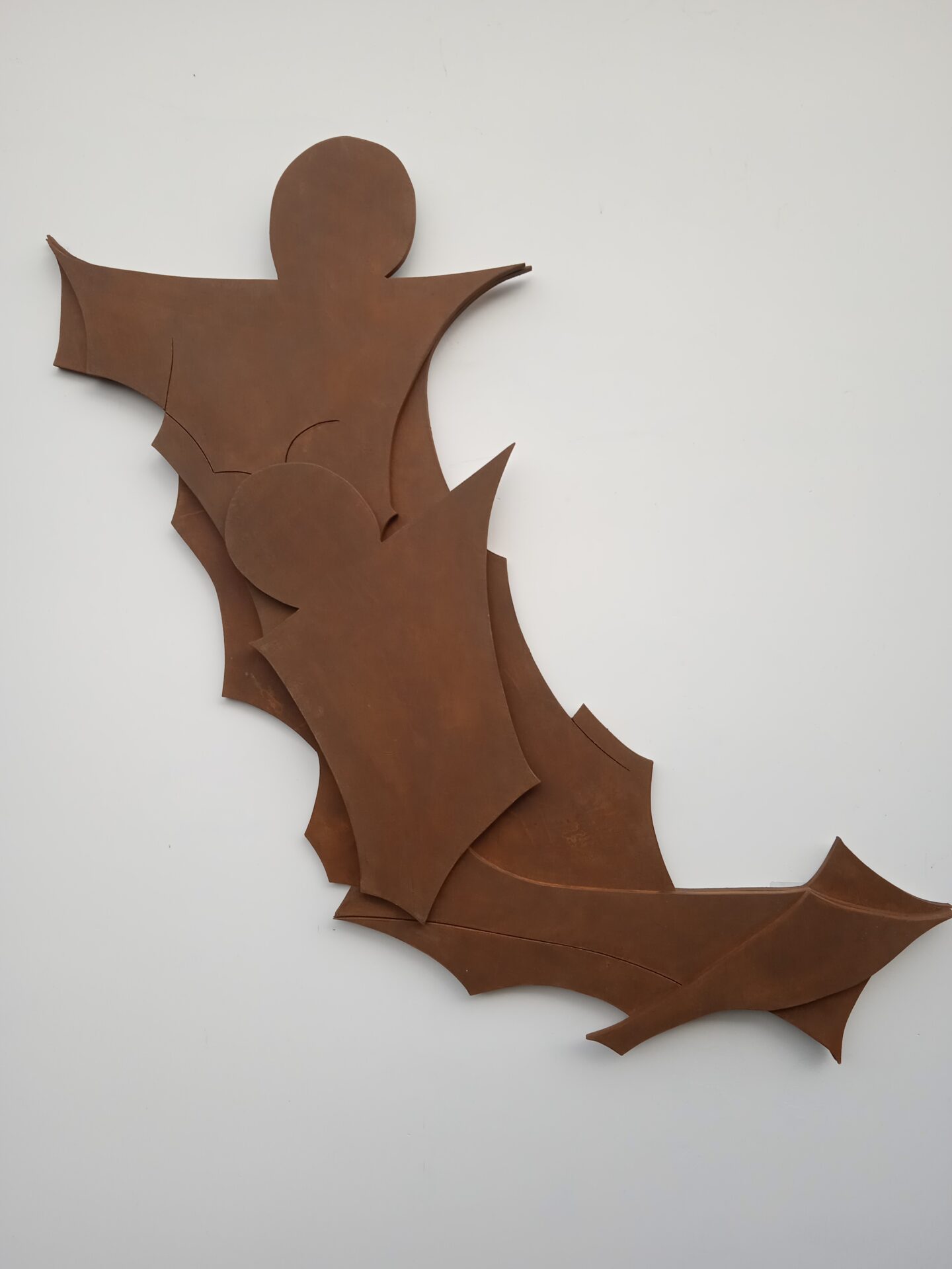 Rzeźba powstała w 2023 roku , podłożem pracy jest sklejka o grubości 12 mm . Całość wykonana jest z 3- ech warstw sklejki. Praca posiada cechy dla stylu futuryzm , fantastyka .Wśród barw dominuje kolor realistycznie ukazujący efekt rdzy , metalu . Efektownie ukazana jest imitacja zacieków , wżery . Kompozycja jest pełna ruchu i dynamiki .Praca powstawała około miesiąca. Pasuje do kazdego typu przestrzeni : industrialnej , minimalistycznej czy kolonialnej .Wymiary rzeźby wys . 102 cm , szer . 100 cm .Praca wymaga zawieszenia w dwóch punktach. .