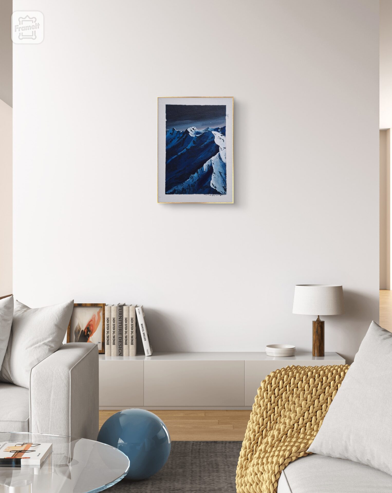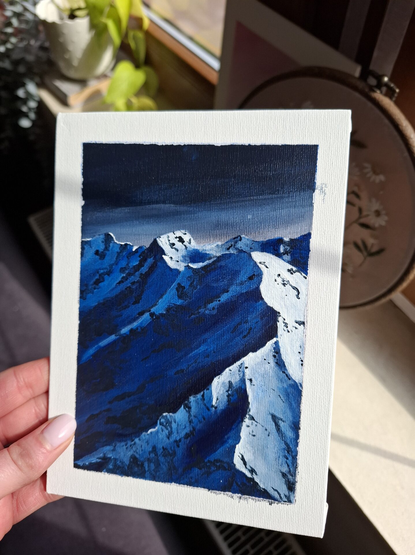 Obraz gór w przewadze koloru niebieskiego. Obraz namalowany na tablicy malarskiej.