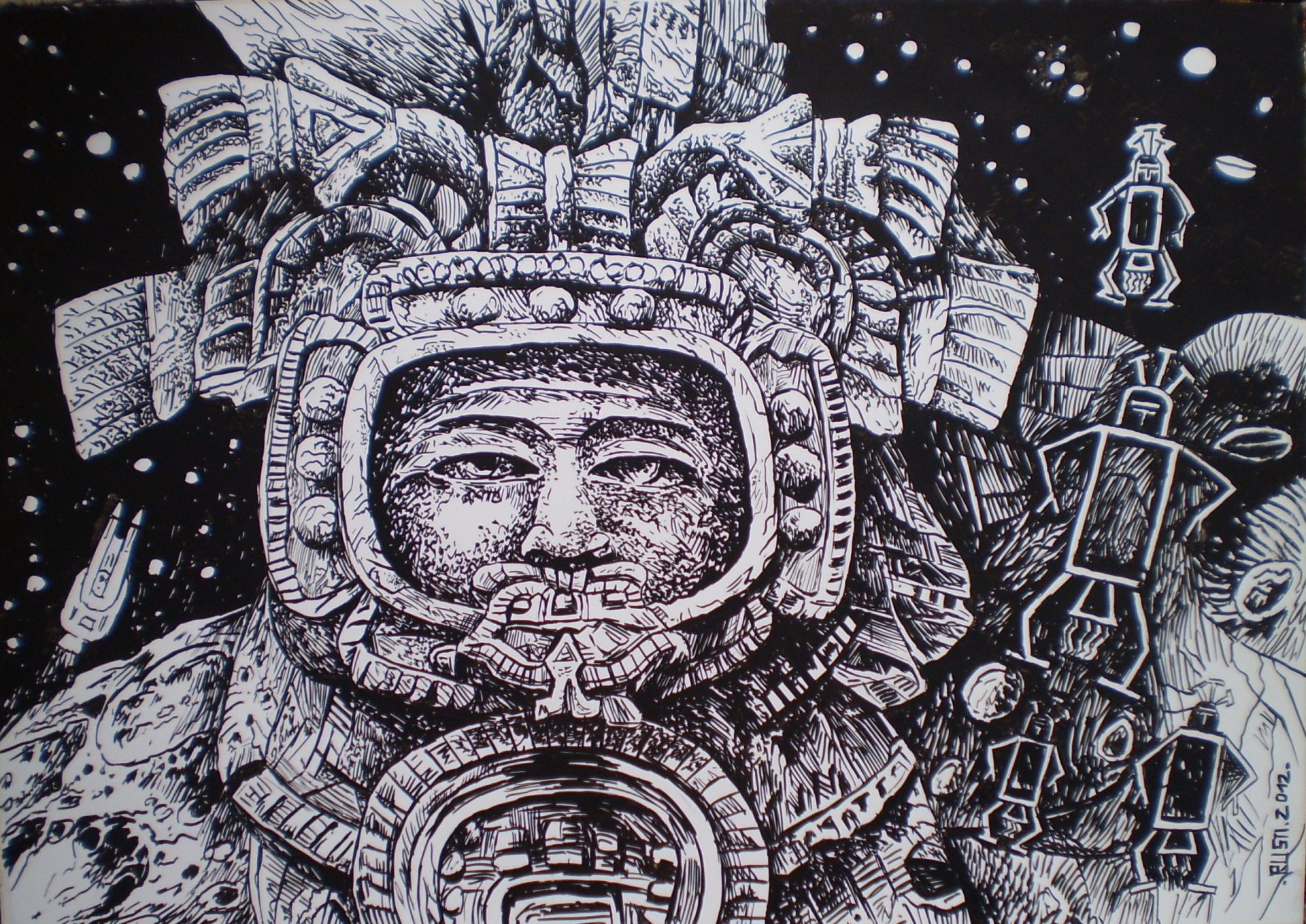 Rysunek na papierze został wykonany tuszem. Format rysunku A3. Inspiracja dawną sztuką Ameryki Południowej i mitami.