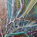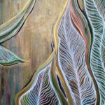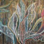 Obraz inspirowany wzorami i kolorami natury, z motywem roślinnym, ujętym w nieco abstrakcyjnym stylu. Wymiary 100×80 cm, boki zamalowane.