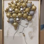 Abstrakcja w pocztówkowym formacie, „włosy” wykonane z bombek w kolorze srebra i złota, całość oprawiona w ramki w kolorze złota. Mały obrazek komponujący się w każdym wnętrzu / w biurze, w kuchni, sypialni, na salonach/ nadając otoczeniu klimatu i subtelności. Można postawić lub powiesić /ramka zaopatrzona w podpórkę/.