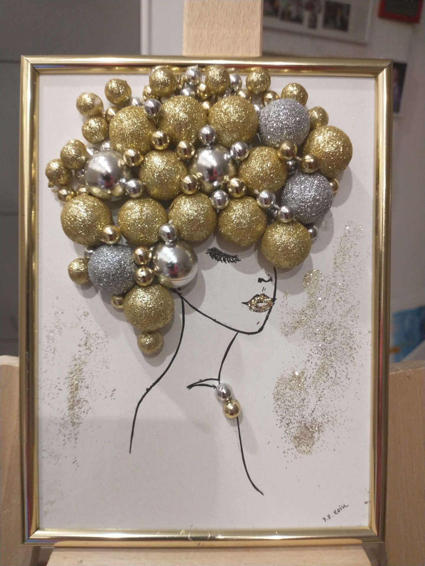 Abstrakcja w pocztówkowym formacie, „włosy” wykonane z bombek w kolorze srebra i złota, całość oprawiona w ramki w kolorze złota. Mały obrazek komponujący się w każdym wnętrzu / w biurze, w kuchni, sypialni, na salonach/ nadając otoczeniu klimatu i subtelności. Można postawić lub powiesić /ramka zaopatrzona w podpórkę/.
